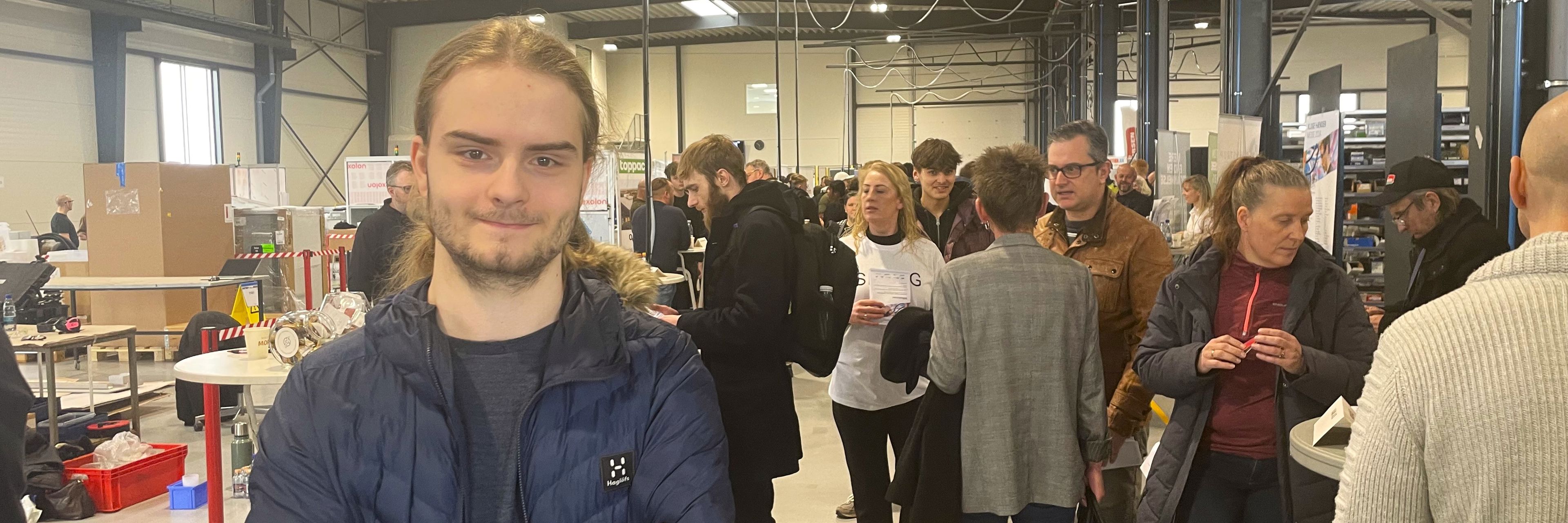 "Jeg prøver at finde ud af, hvad jeg gerne vil, så planen er at tale med virksomhederne og lade mig inspirere," sagde Gustav Riis flankeret af virksomhedsstande og messedeltagere i den store lagerhal hos SAXE Hansen syd for Randers, hvor messen i år blev afholdt.
