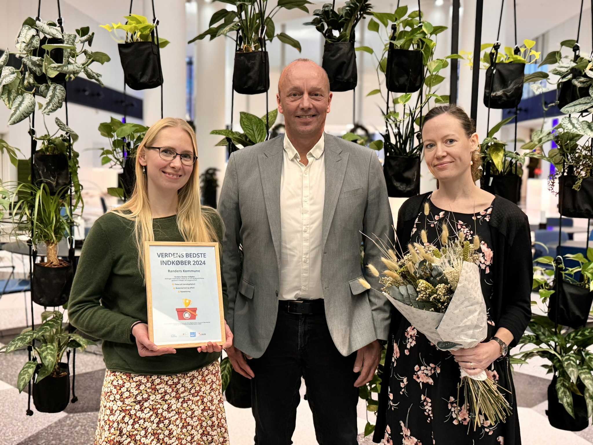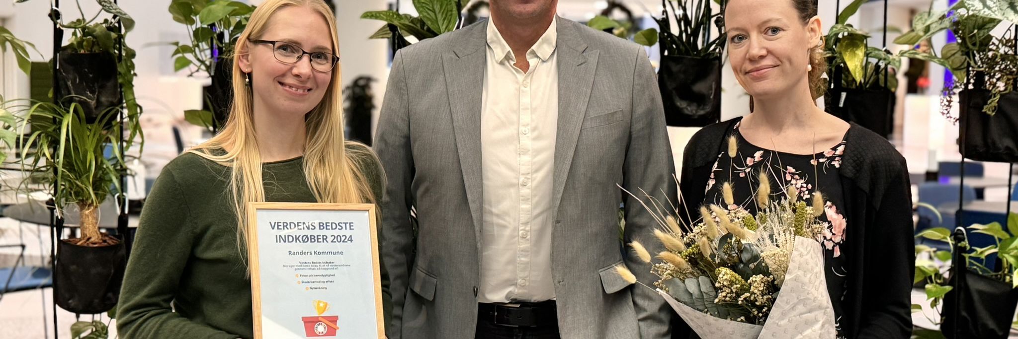 Repræsentanter for Udbuds- og indkøbsafdelingen i Randers Kommune tog imod prisen som Verdens bedste indkøber 2024. På billedet er det fra venstre Camilla Oxholm Sørensen, Peter Neumann og Sanne Nelveg Nielsen fra Udbud, Indkøb og kørsel i Randers Kommune. Foto: Etisk Handel