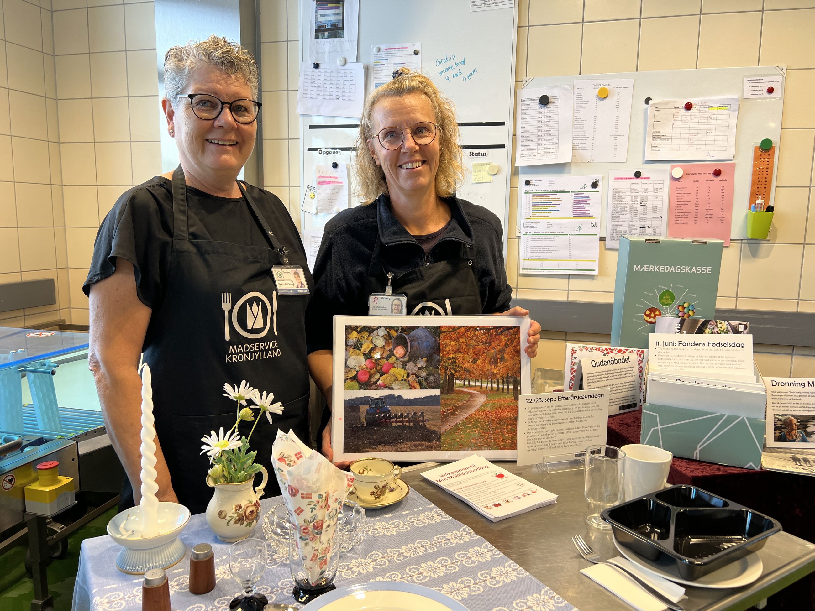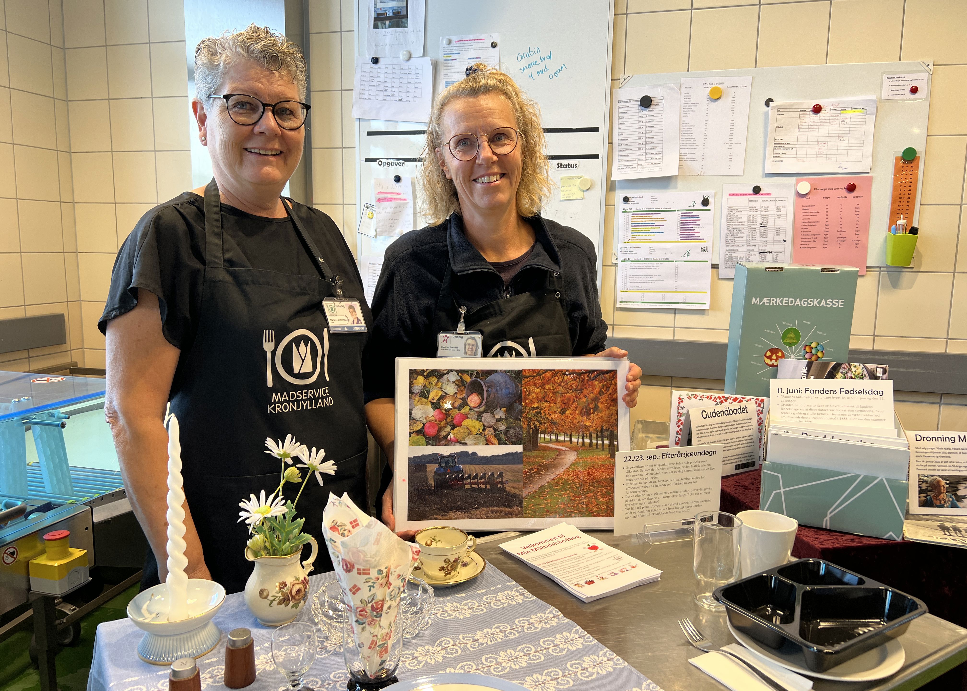 Til årets resterende 312 dage har medarbejderne i "Det Gode Måltid" lavet dækkeservietter med temaer som årstider, vejrvarsler og lokal kultur, historie og erhverv. En af gæsterne til åbent hus-arrangementet peger på en af dem og udbryder begejstret "Gudenåbadet!". "Ja, kan du huske det?", sporger Lise Fuhr Frandsen - og så er samtalen i gang.