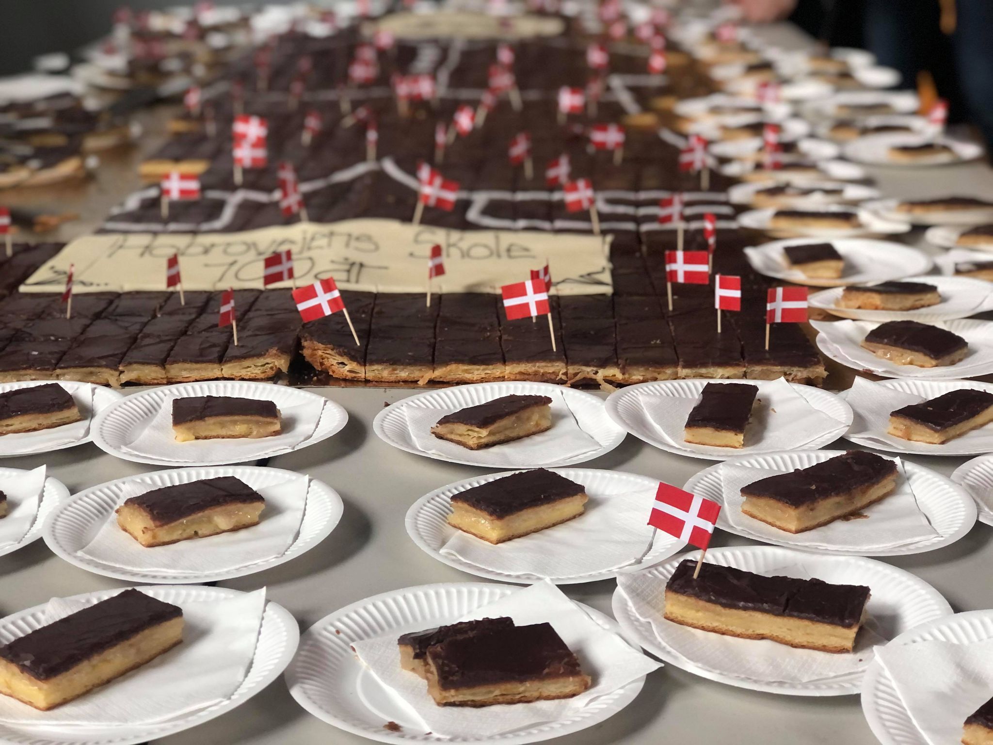 Under optræden i skolegården fik bornene uddelt jubilæumskage og sodavand, ligesom eleverne også får en goodiebag med hjem fra skole, som de skulle bruge til jubilæumsfejring hjemme i stuerne.