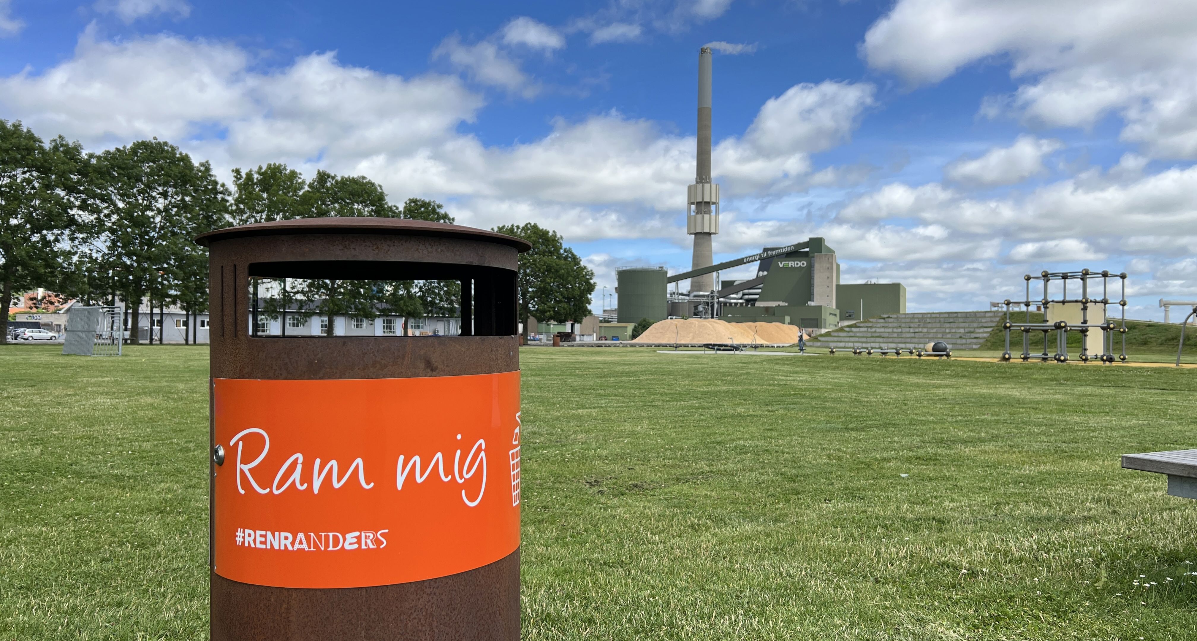 Tronholmparken i Randers er en populær park med mange gæster og aktivitetsområder. De nye orange kraver på skraldespandene skal nudge flere gæster til at smide papir, dåser og take away affald i spandene: