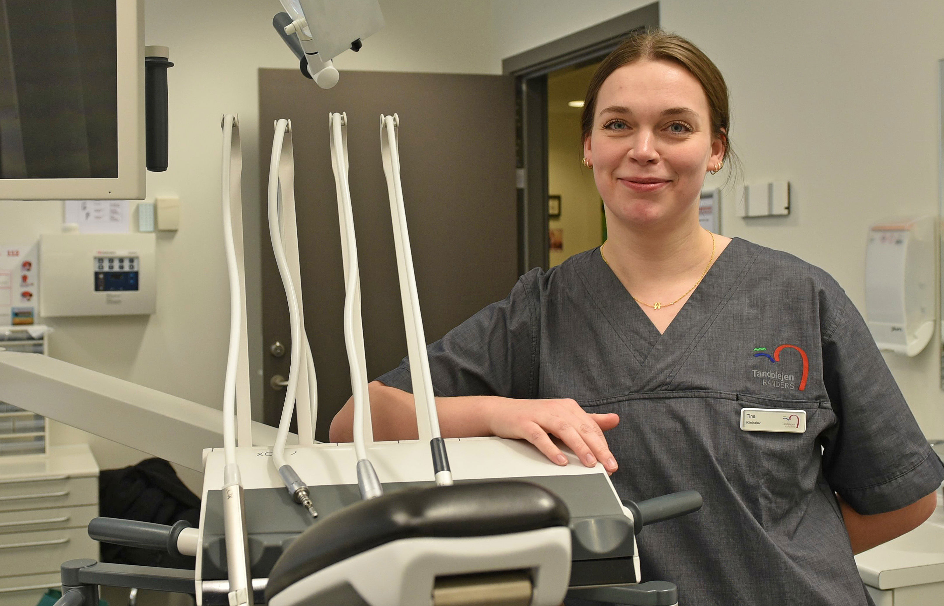 "Det er en dejlig praksisnær uddannelse med masser af afvekslende opgaver. Udover det tætte samarbejde med tandlæge, born og forældre laver vi administrativt arbejde, aftryk til tænder og sorger for alle instrumenter til tandarbejdet. Når jeg engang er færdig med uddannelsen, kan jeg også lave borneundersogelser og mundhygiejnekontrol," fortæller Tina Sommer Dahl.