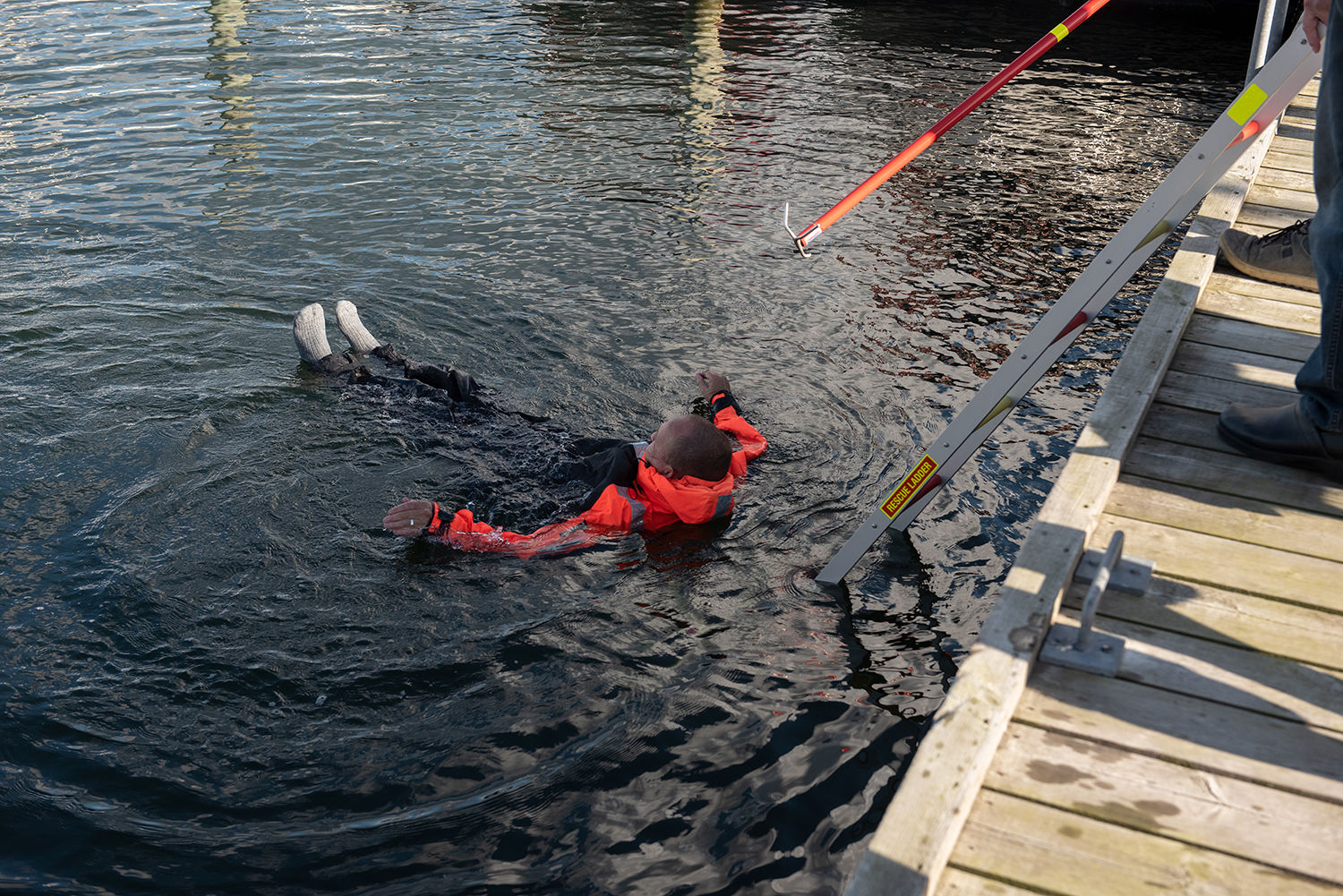 "Vi har gennem længere tid haft et ekstra oje for sikkerheden på havnen. Dagens gennemgang og afprovning af vores sikkerhedsudstyr er sidste skridt til, at vi kan få certifikatet som Sikker Havn," fortæller havnefoged Christian Heibel Godsk, der selv måtte hoppe en tur i havnebassinet for at få testet sikkerheden.