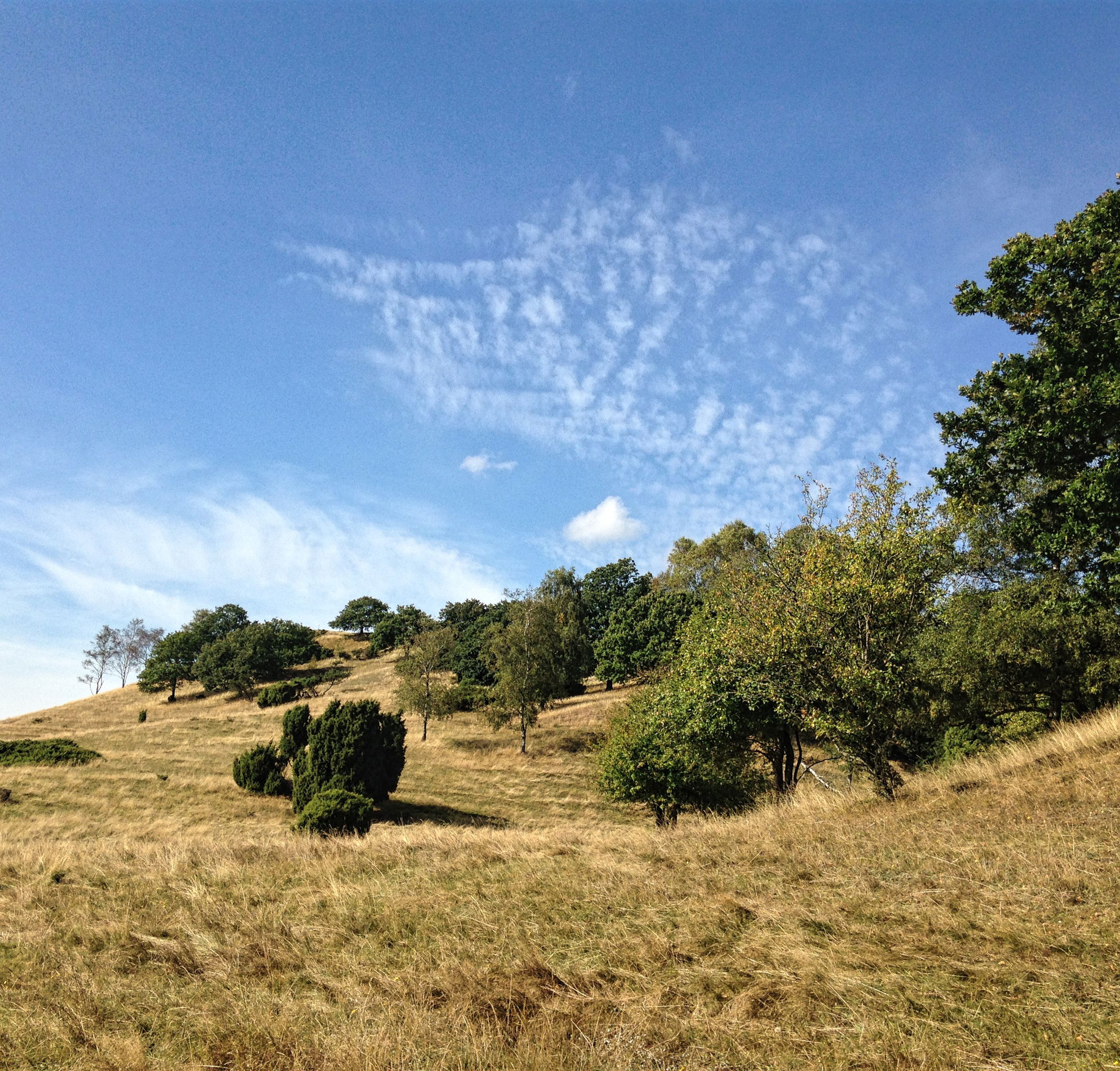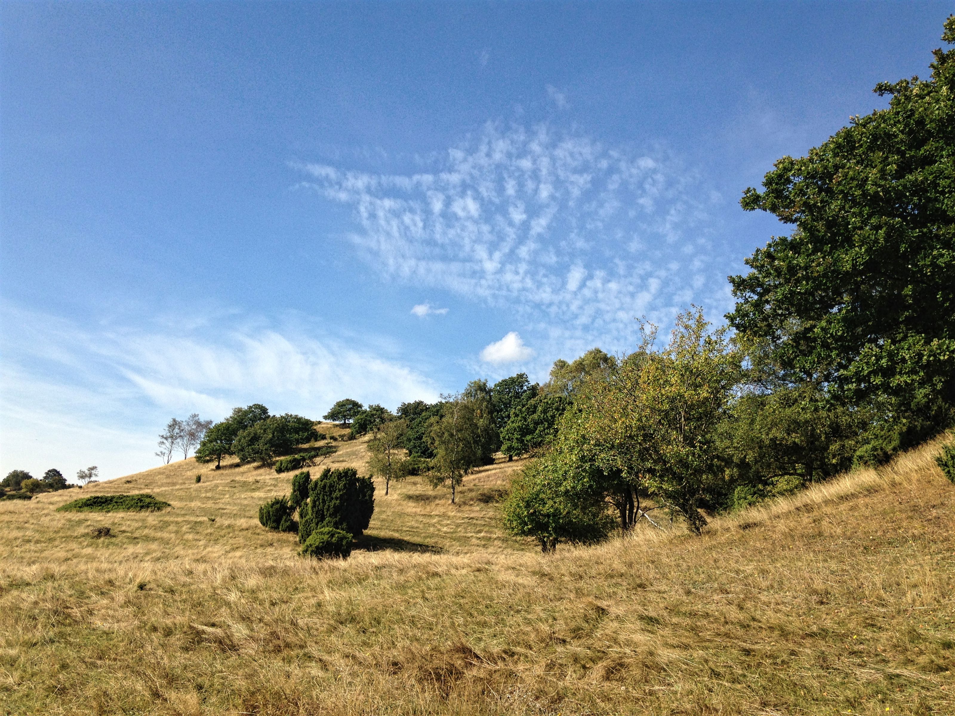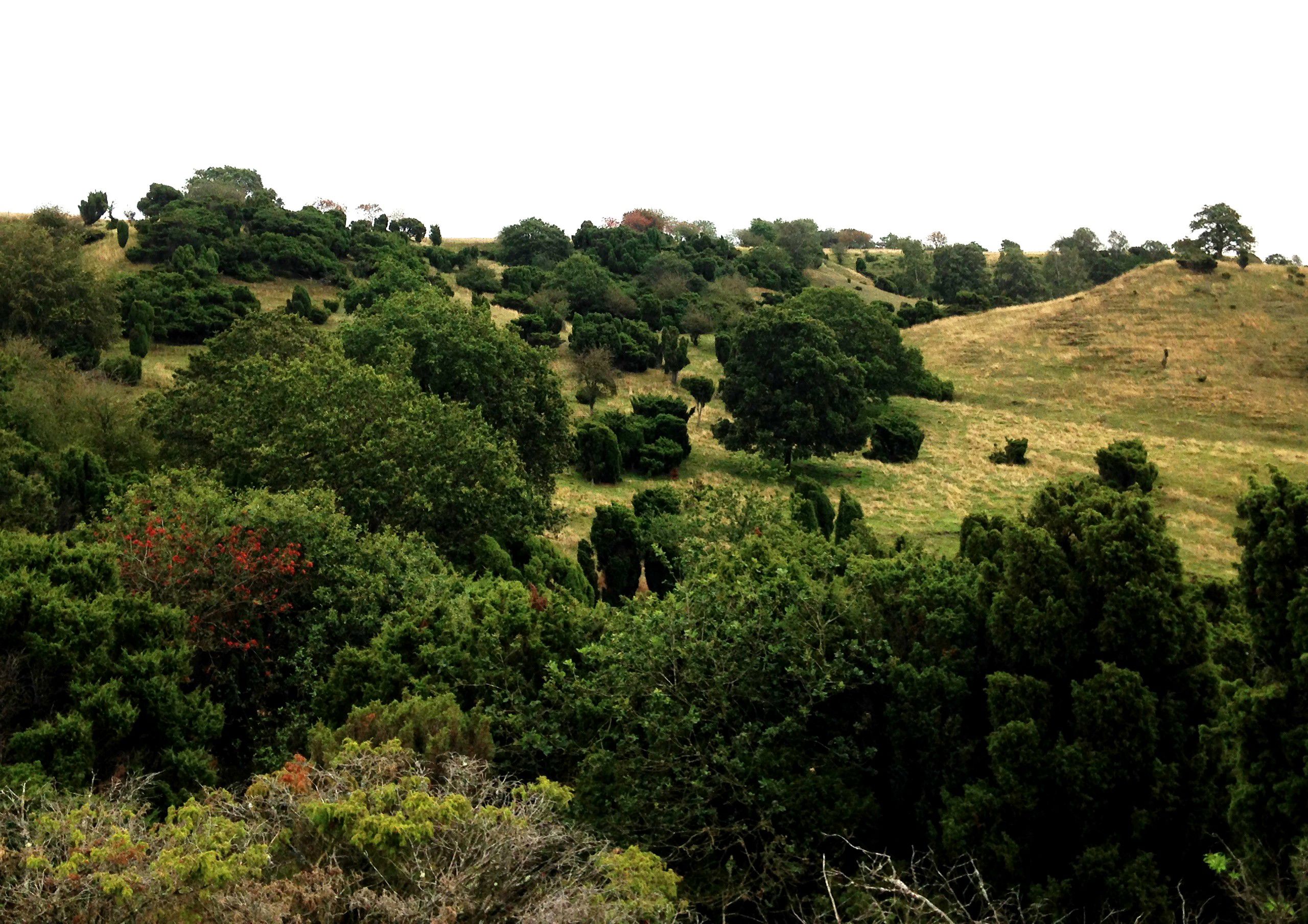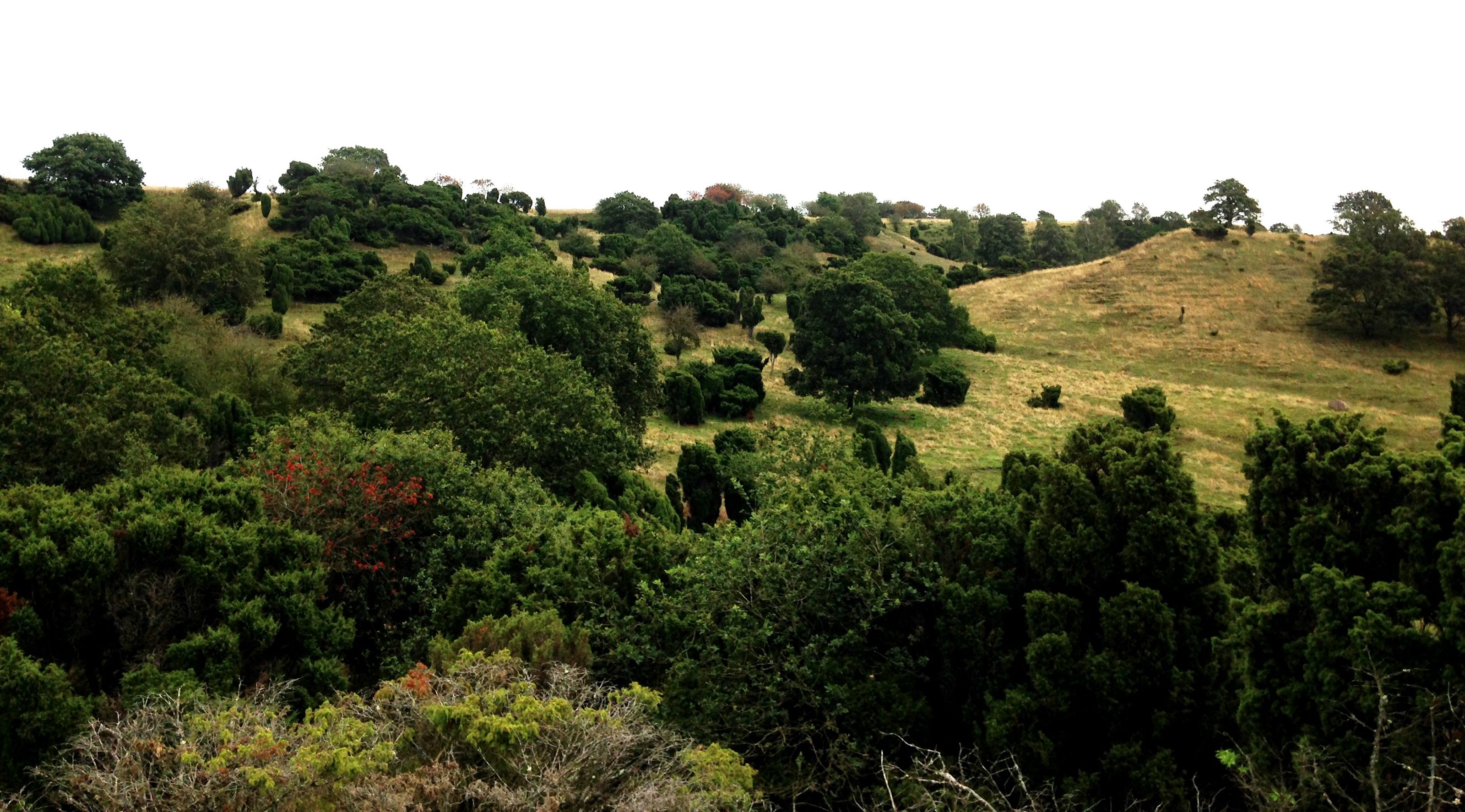 På sydsiden er bakkerne græsklædte med en del spredte enebær, vildæbler, ege- og birketræer.