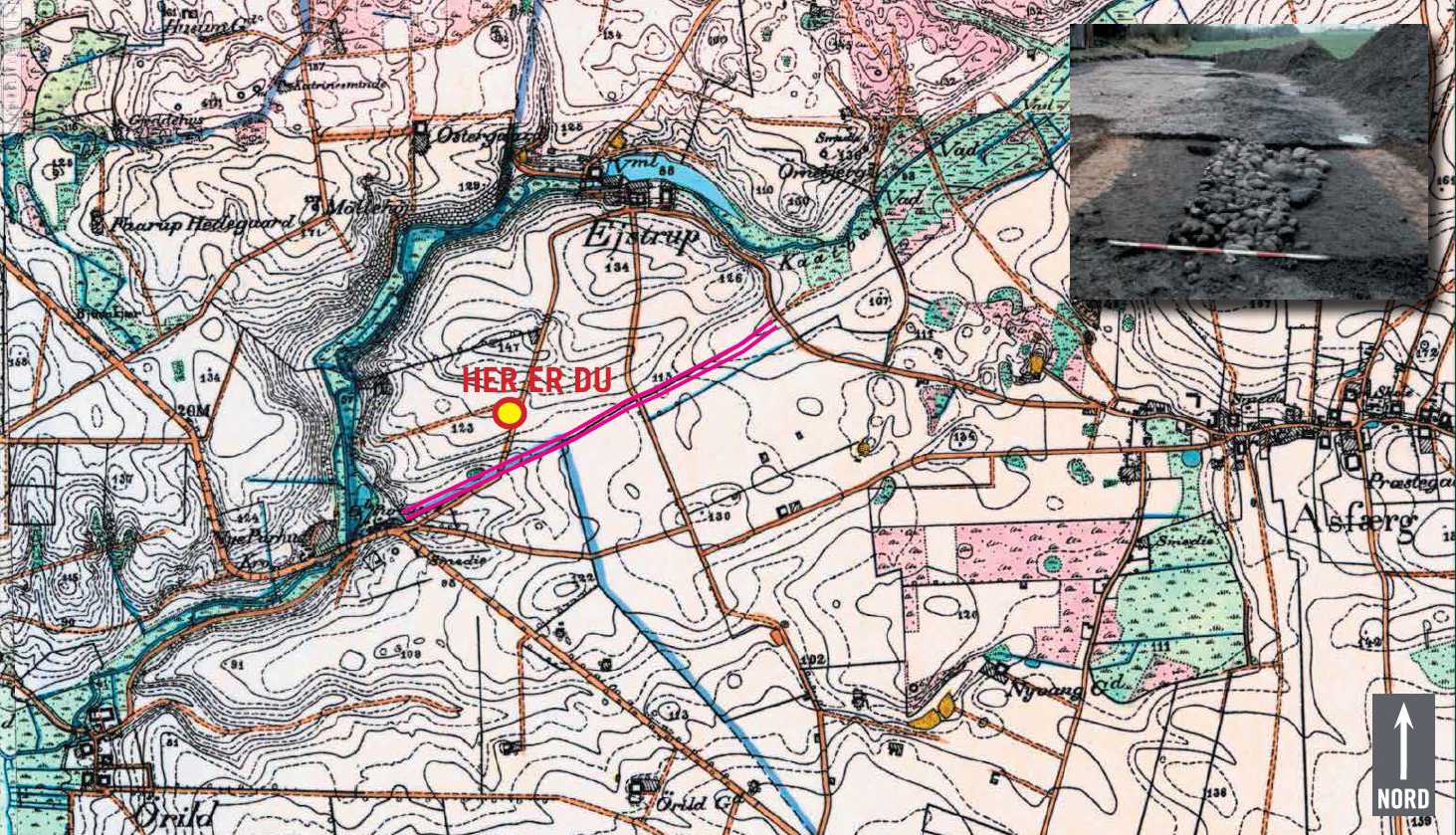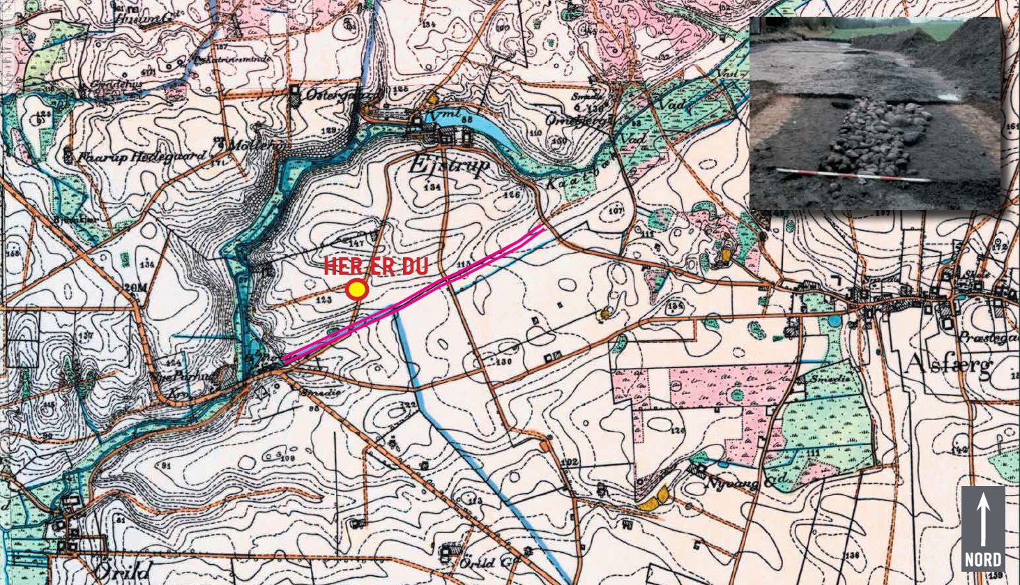 Hvad skuer mit øje… Hvor Ejstrupvej stopper brat og bliver til mark, rejser et dige sig af landskabet og løber sydover så langt øjet rækker. En tavle på stedet fortæller, at jordvolden hedder Dandiget, og at diget ikke er et almindeligt skeldige. Det er vist på gamle kort, hvor man målte i fod og alen. Og udgravninger i forbindelse med byggeriet af motorvej E45 i begyndelsen af 1990’erne har påvist, at volden skulle være anlagt helt tilbage i den tidlige jernalder - altså engang omkring Jesu fødsel.