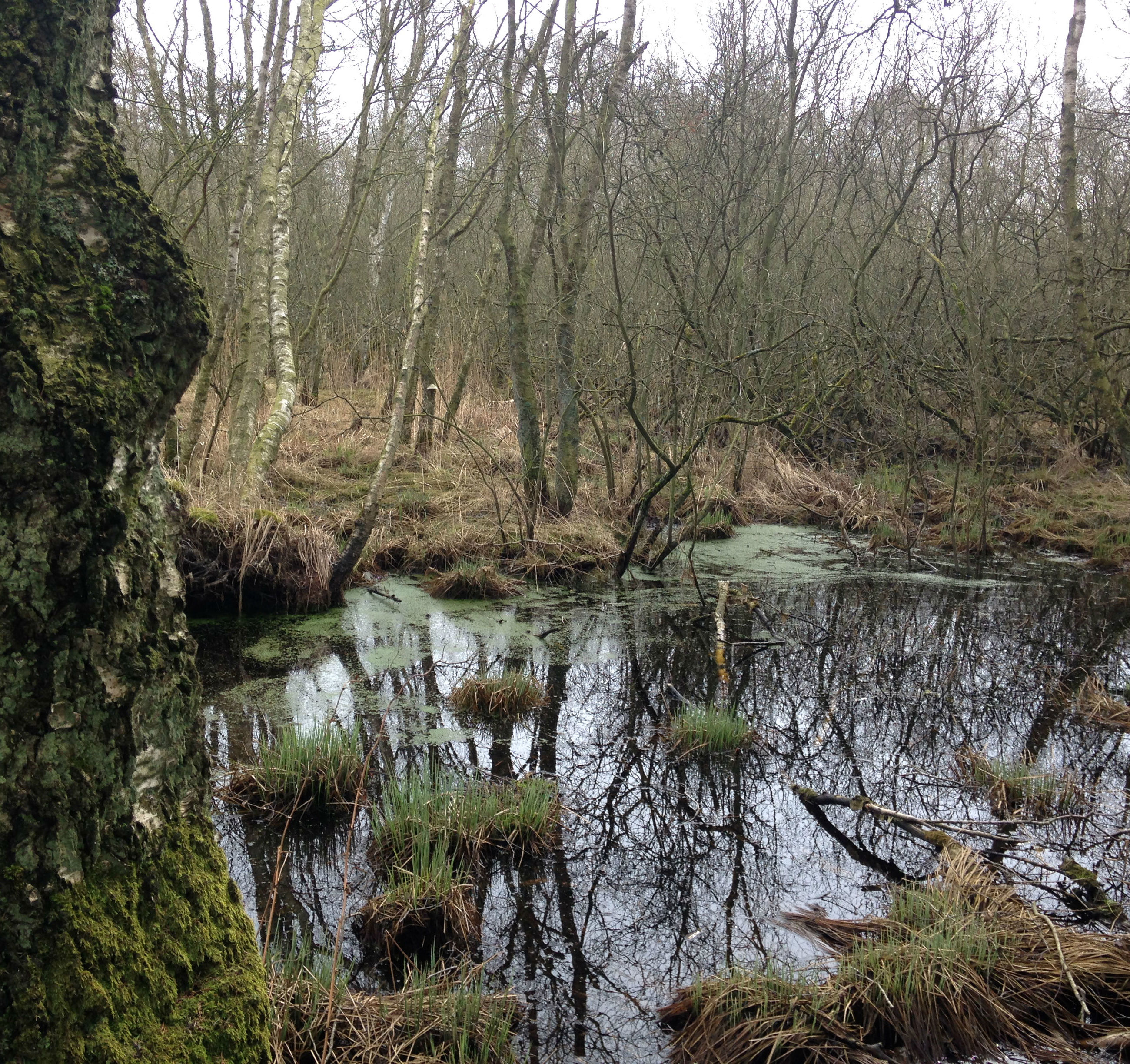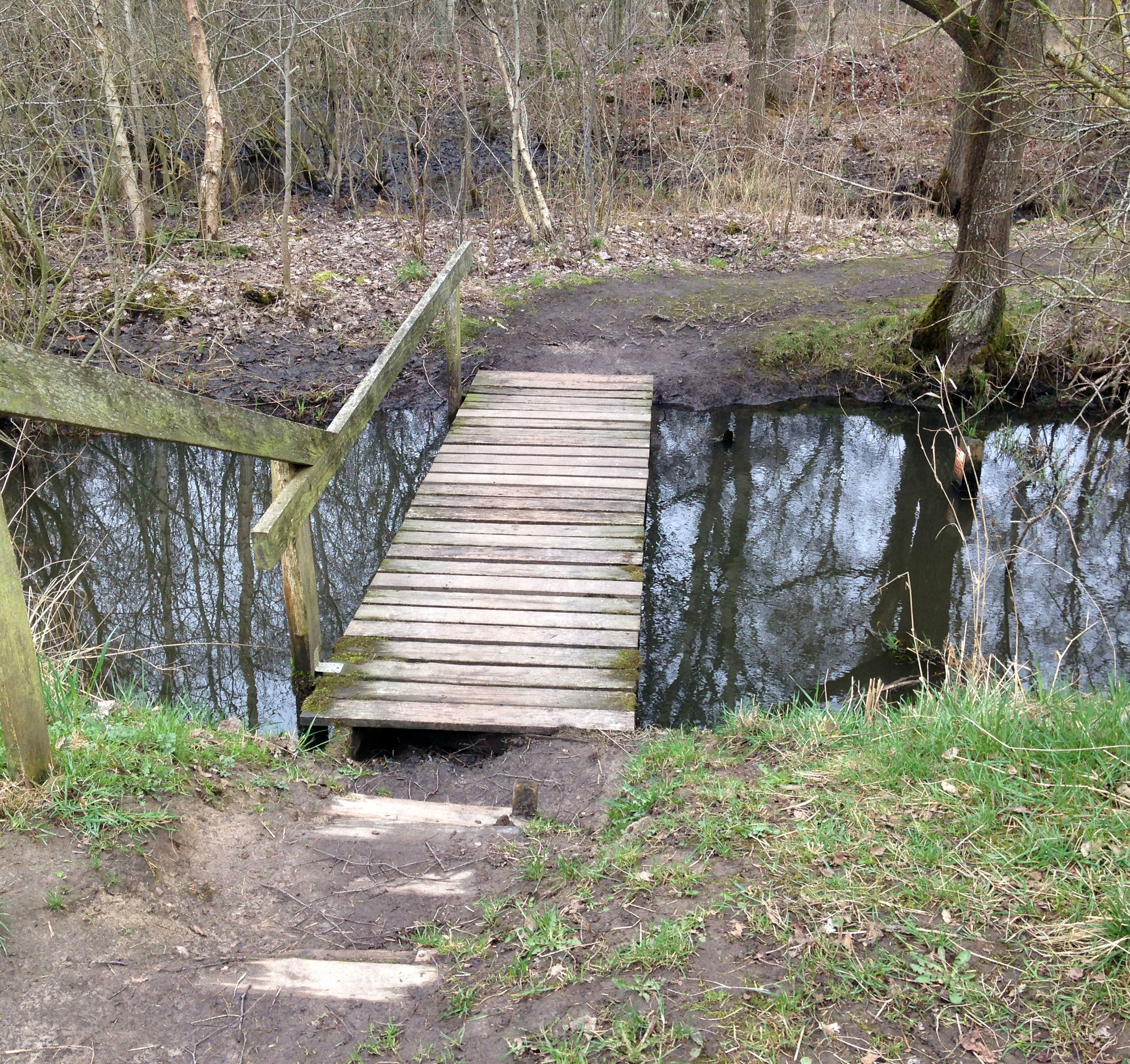Et sving over en bro og ind i skovmosen. Birketræer og brun højmosebund på skovstien. Og små, dybe tørvegrave der ligger som perler på en snor langs stien.