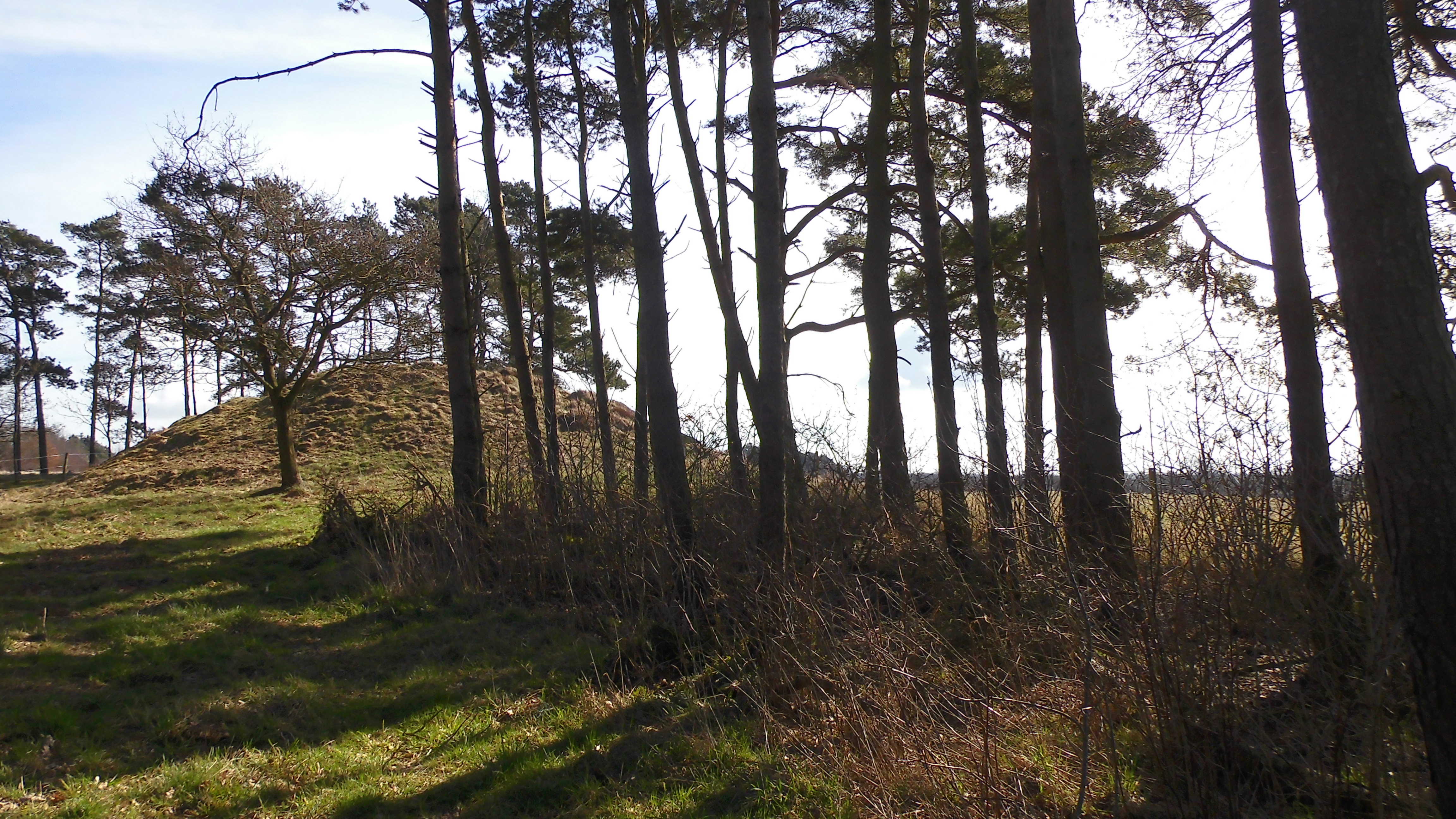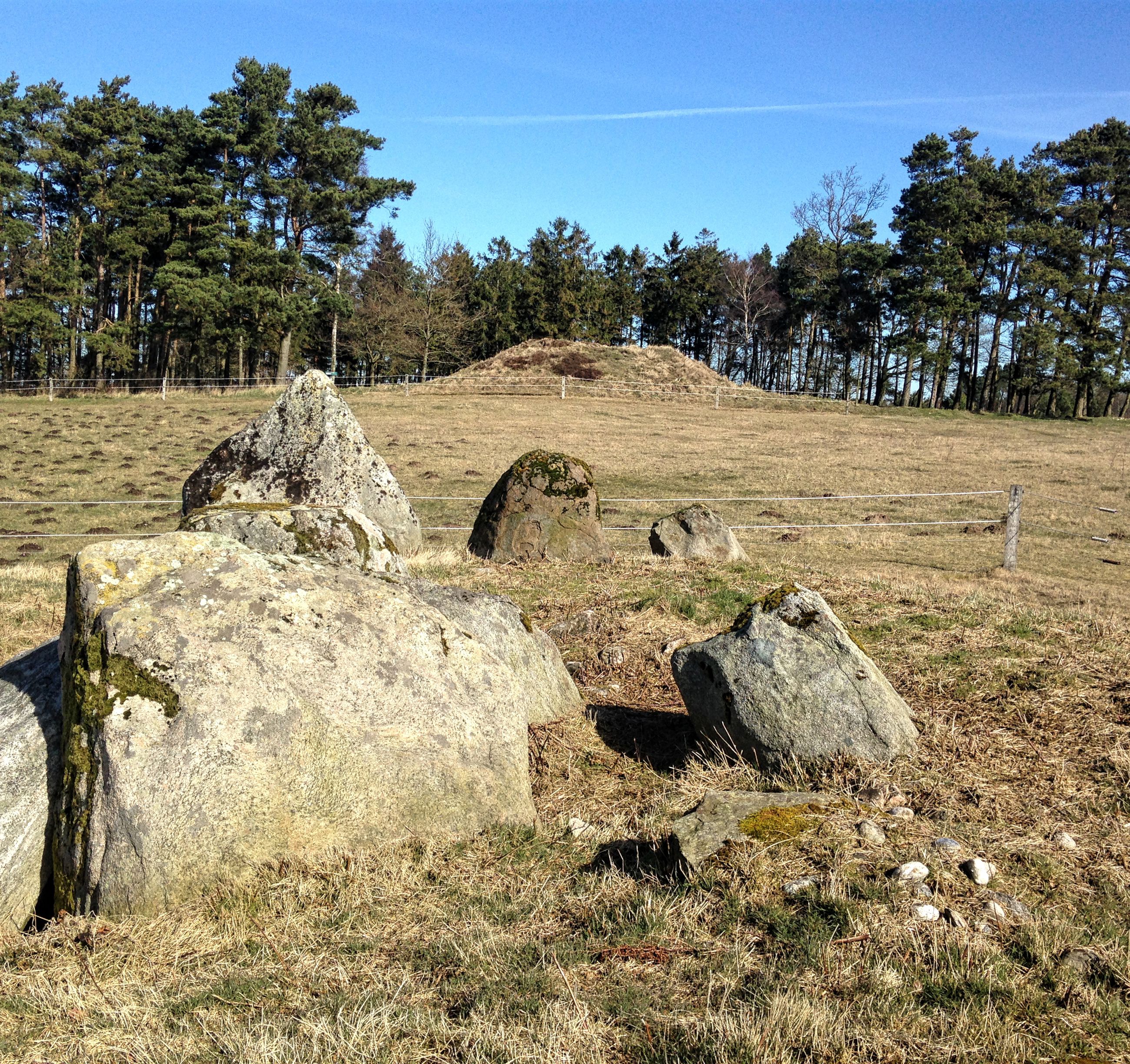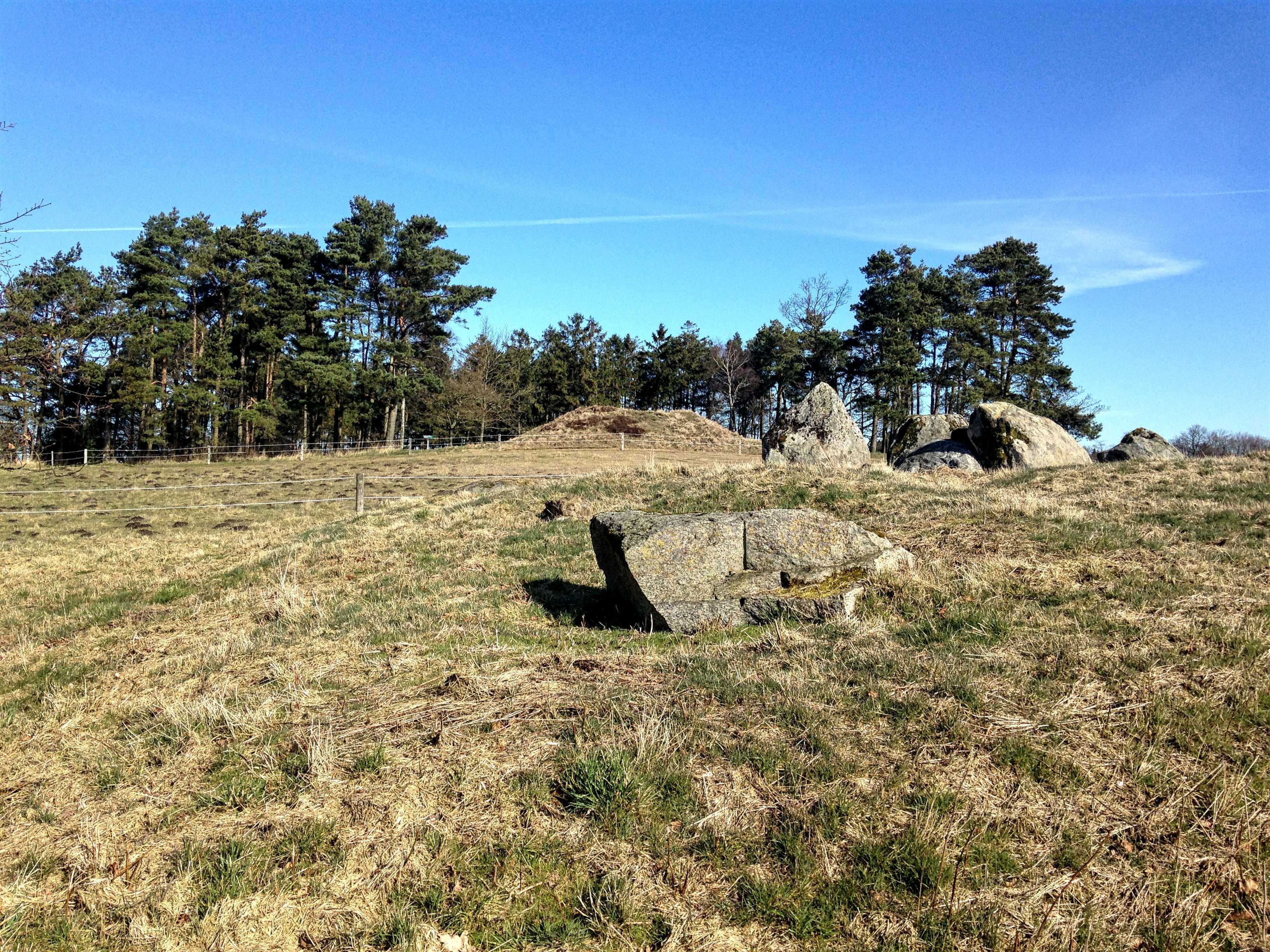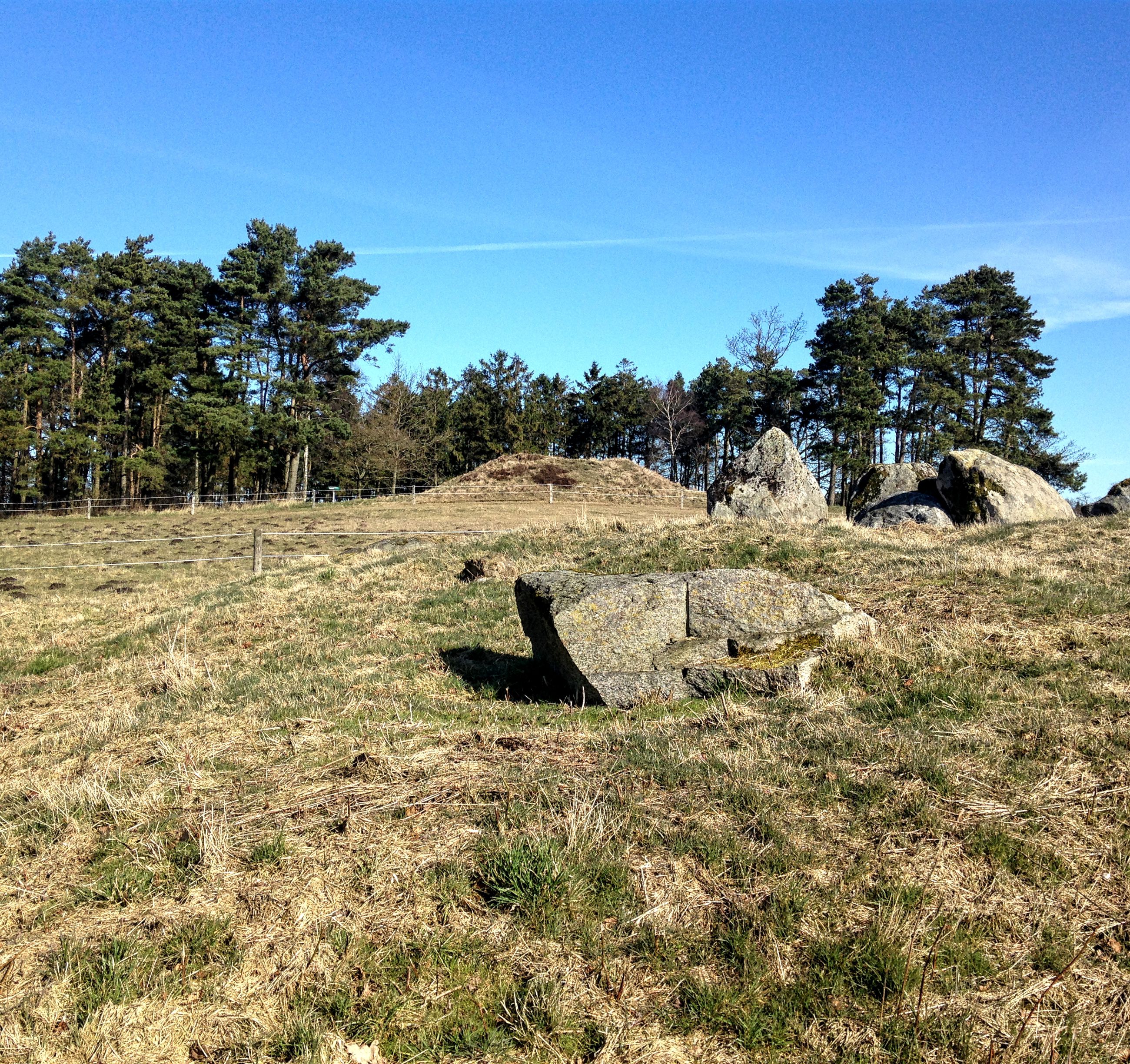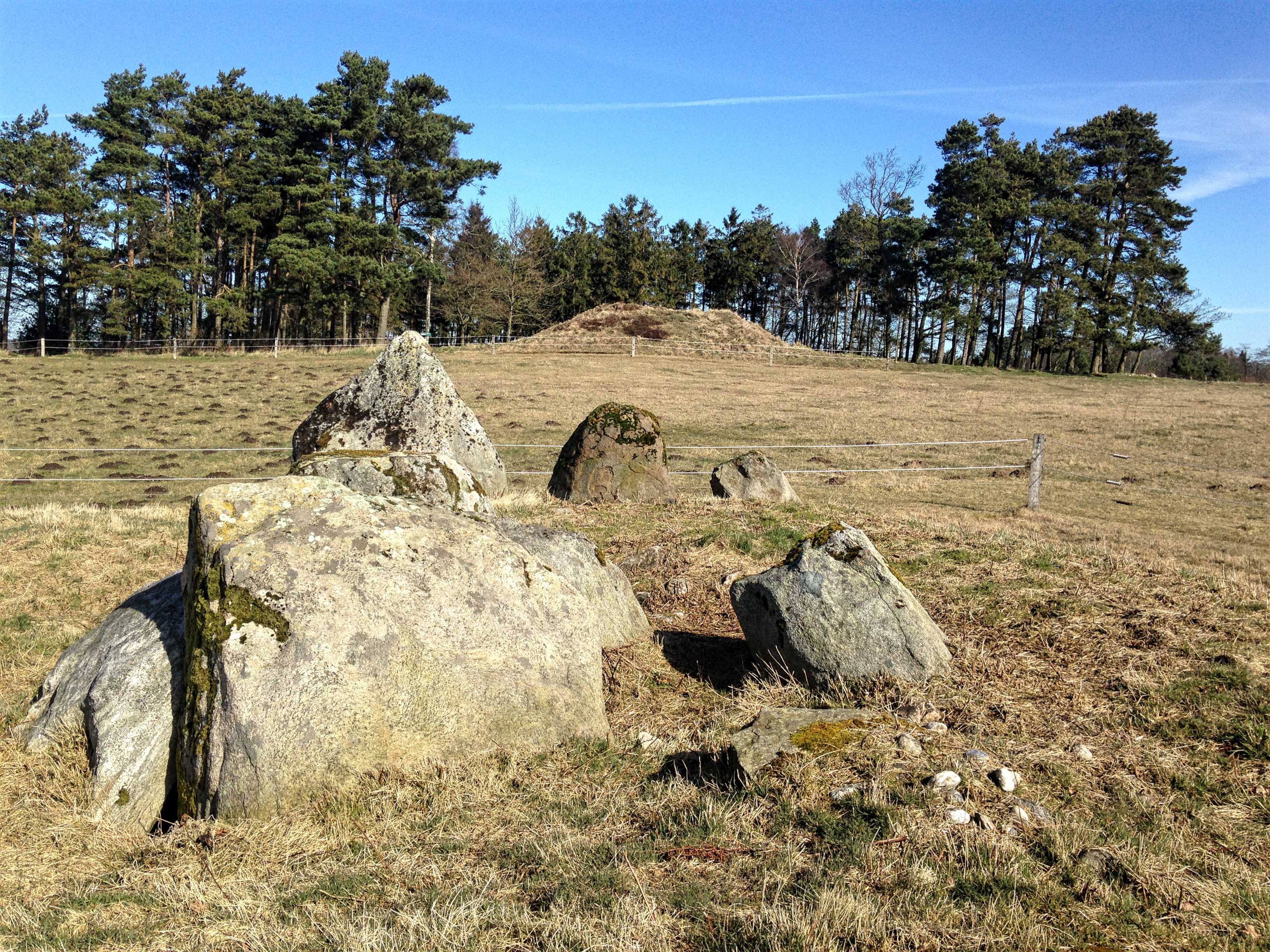 I sydsiden af en lille fyrrelund langs det vestlige markskel ligger først en stor gravhøj, som formodes at være opført for 3-4.000 år siden i ældre bronzealder. Selvom gravhøjen stadig er ganske stor, har den oprindeligt været større. Højens top af afgravet og på siderne ses flere flade afgravninger og slid fra nyere tids agerbrug og afgræsning med kvæg. Trods beskadigelserne formodes højen stadig at rumme gravanlæg. Både de jordfæstegrave i udhulede egekister, som højen først rejstes over - og senere tilføjede sekundærgrave i form af stensatte brandgrave og gravurner.