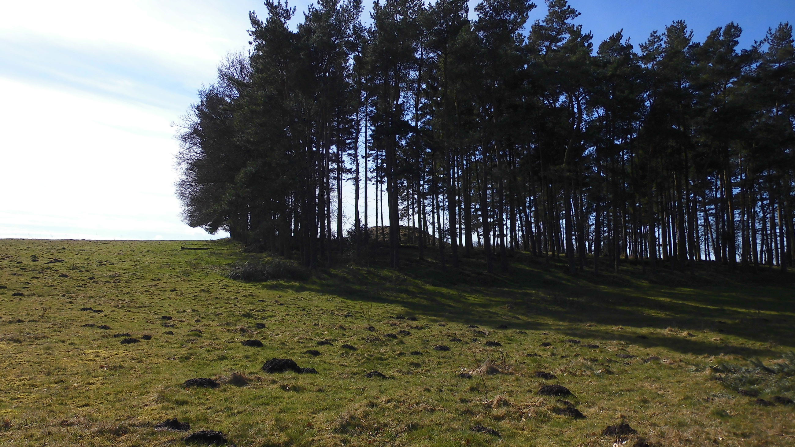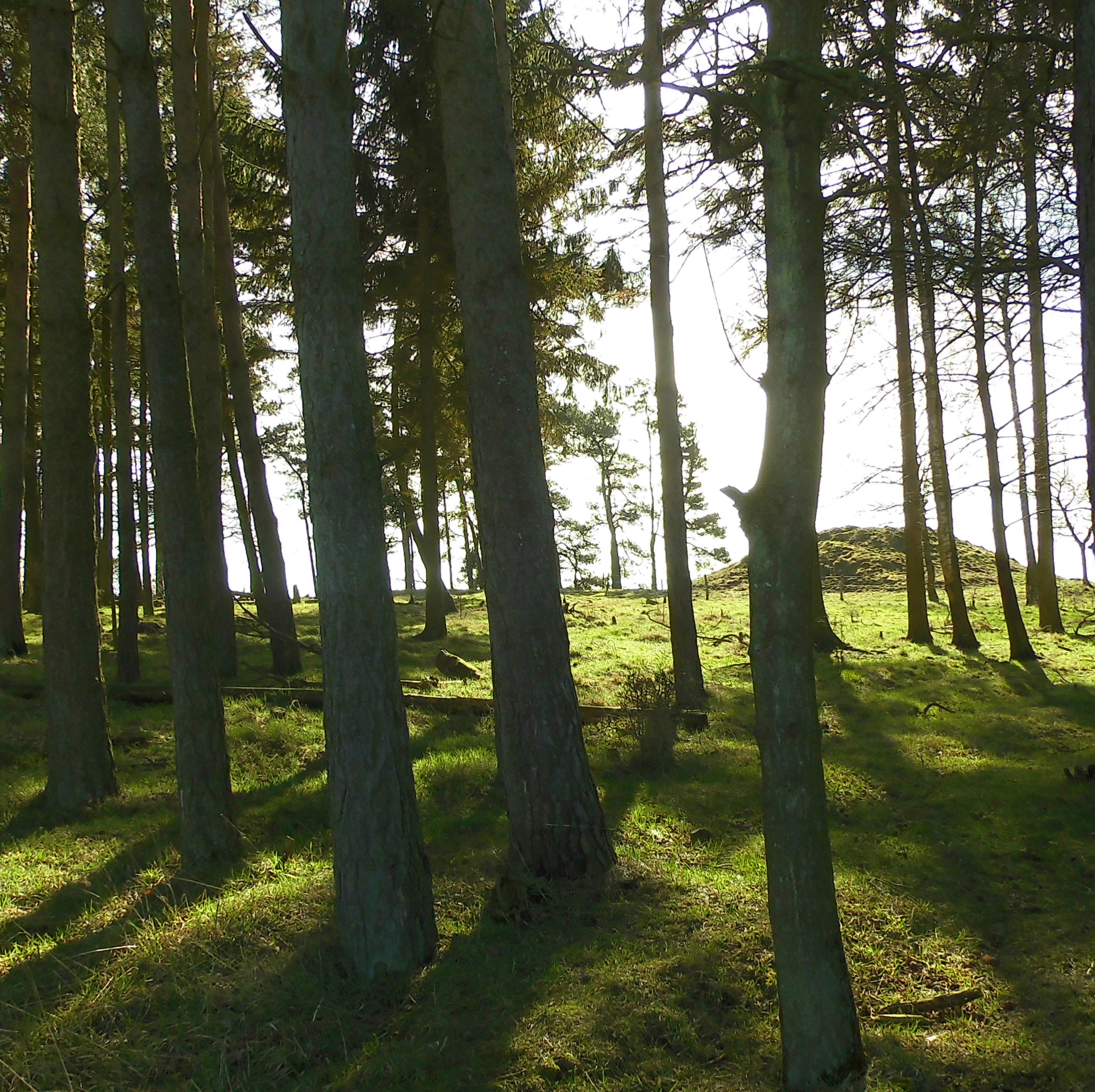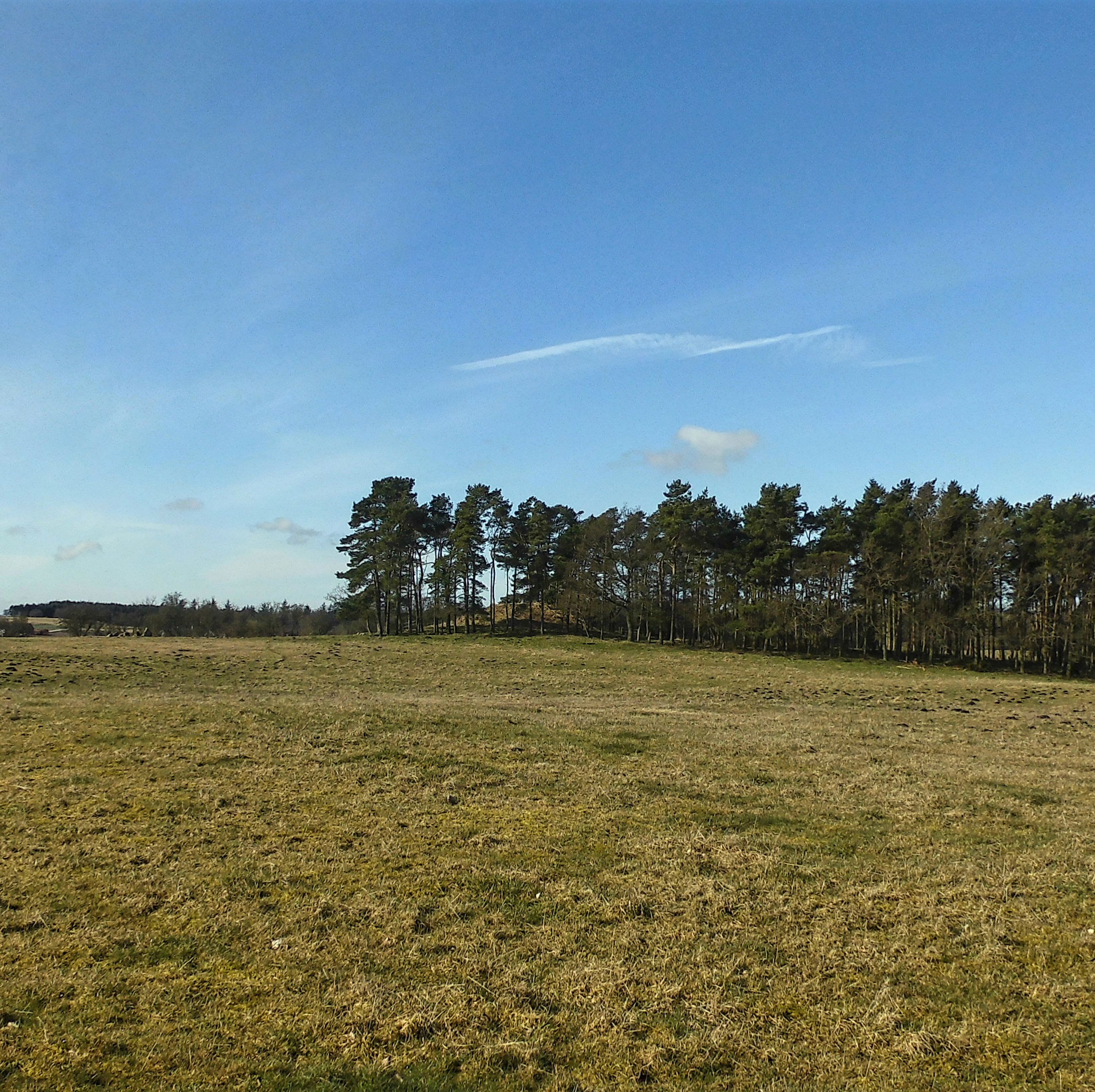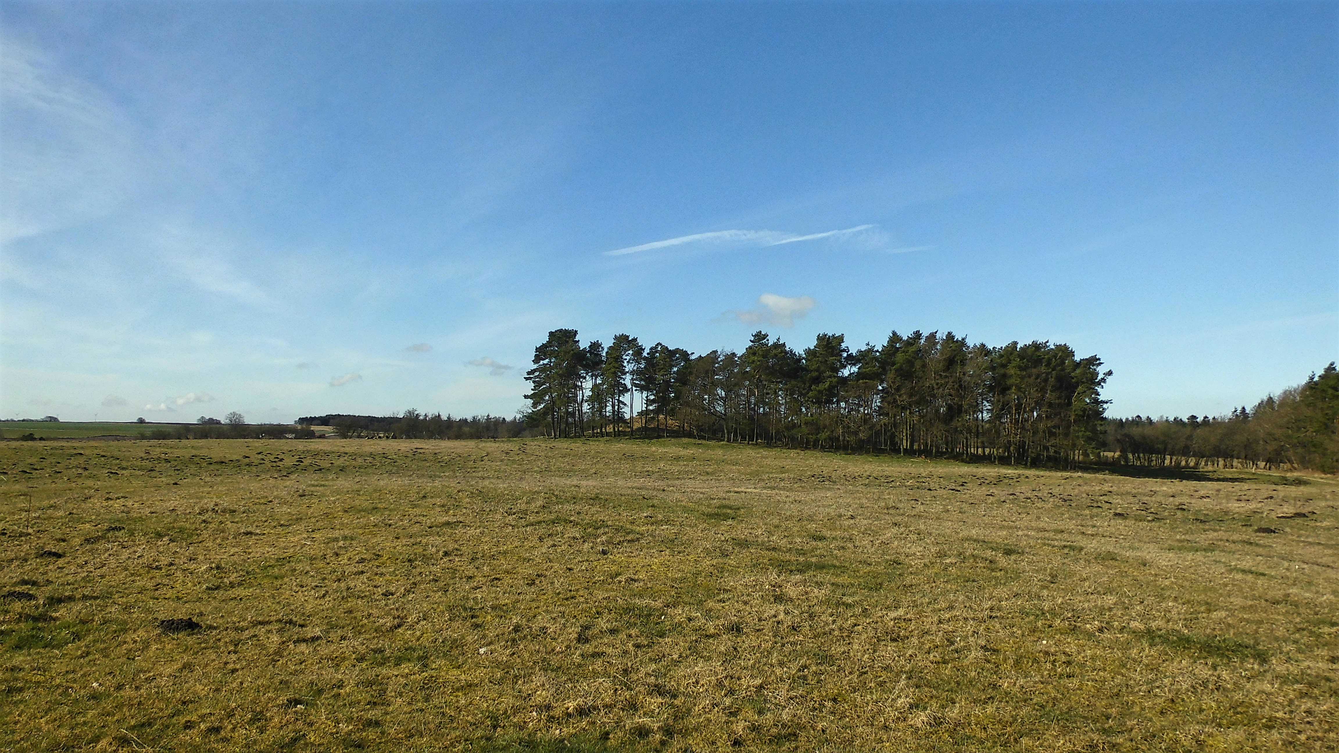 I sydsiden af en lille fyrrelund langs det vestlige markskel ligger først en stor gravhøj, som formodes at være opført for 3-4.000 år siden i ældre bronzealder. Selvom gravhøjen stadig er ganske stor, har den oprindeligt været større. Højens top af afgravet og på siderne ses flere flade afgravninger og slid fra nyere tids agerbrug og afgræsning med kvæg. Trods beskadigelserne formodes højen stadig at rumme gravanlæg. Både de jordfæstegrave i udhulede egekister, som højen først rejstes over - og senere tilføjede sekundærgrave i form af stensatte brandgrave og gravurner.