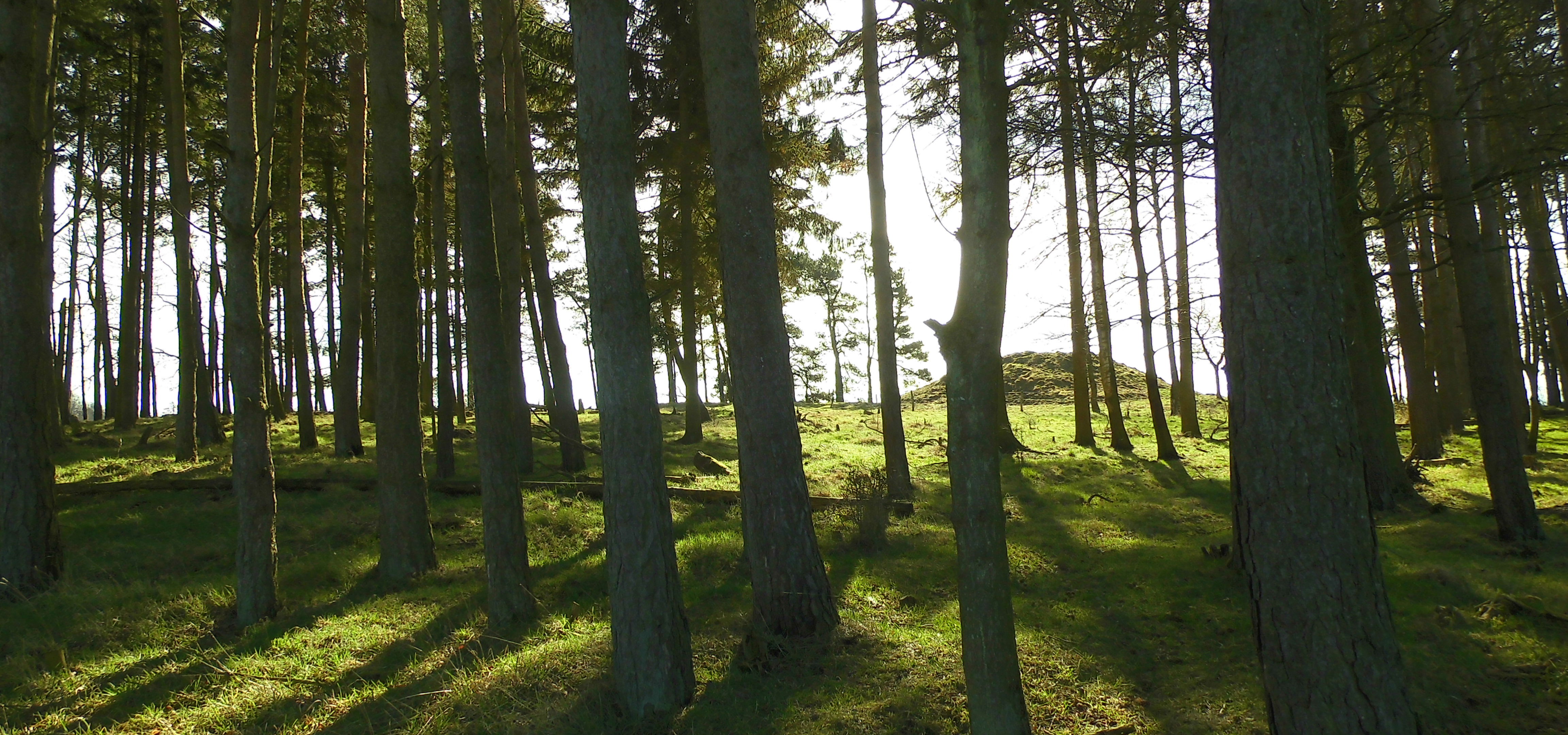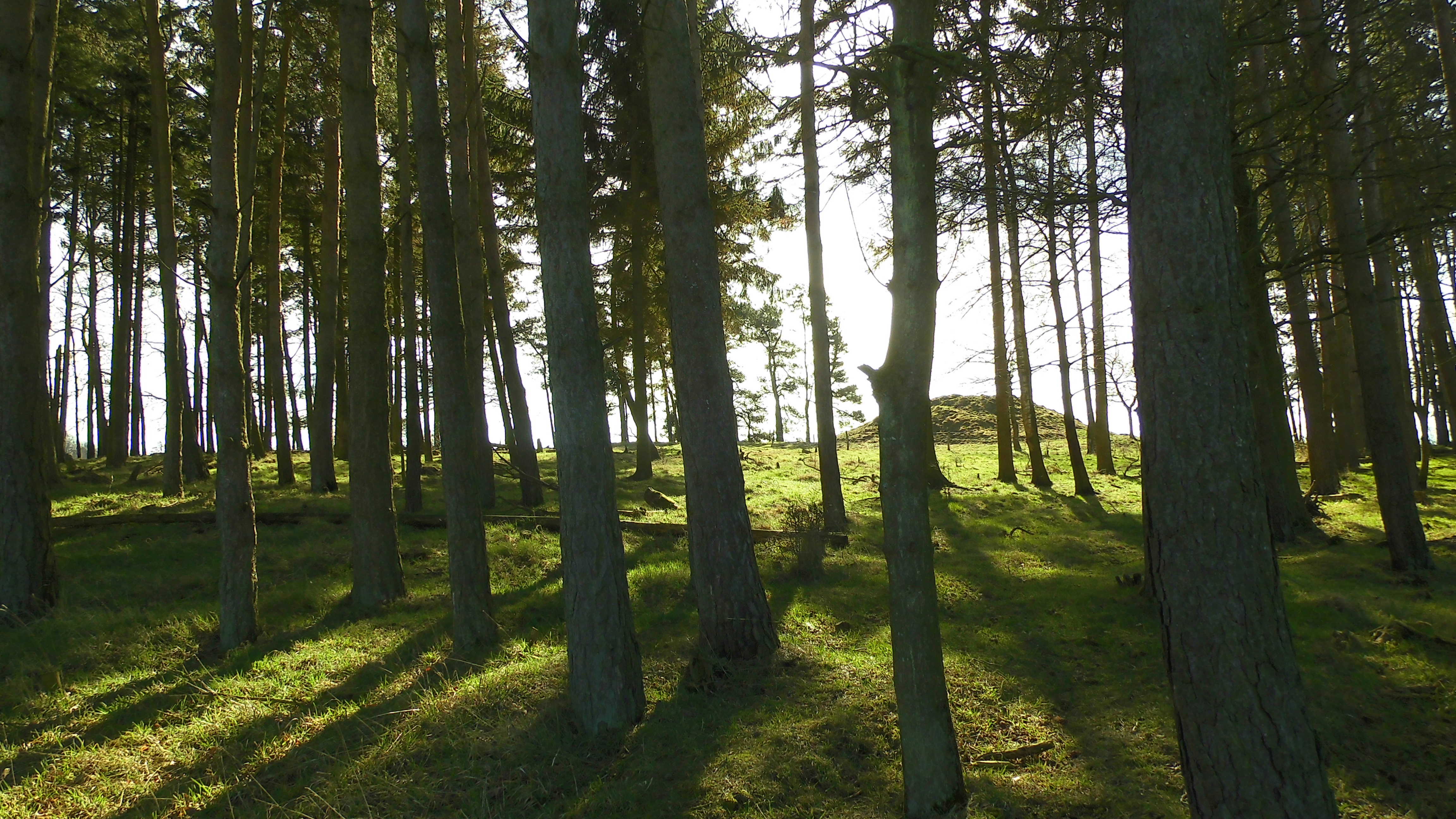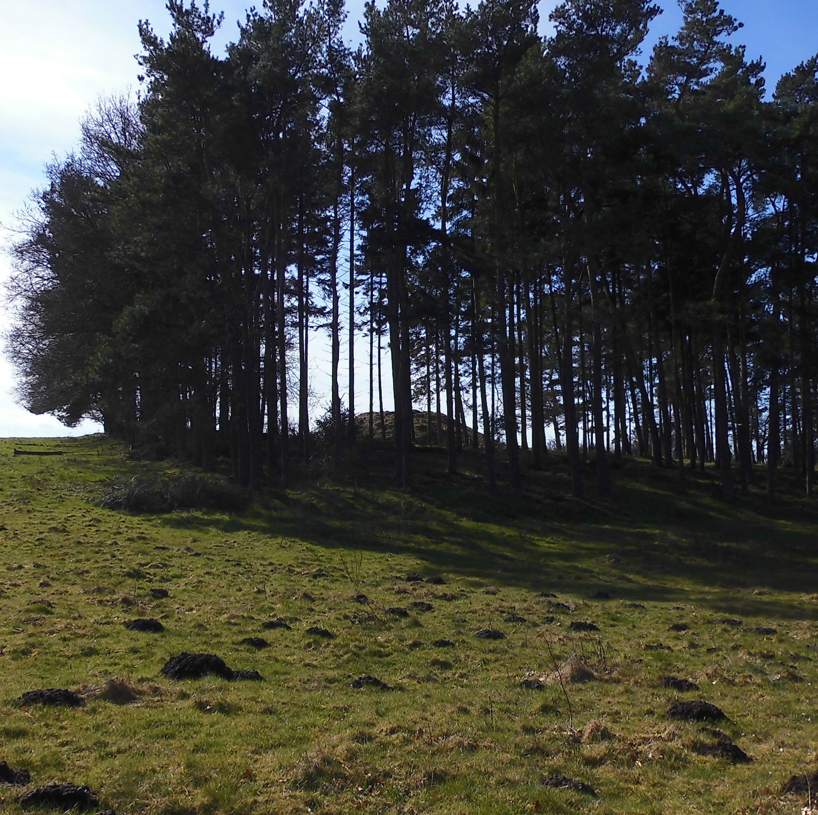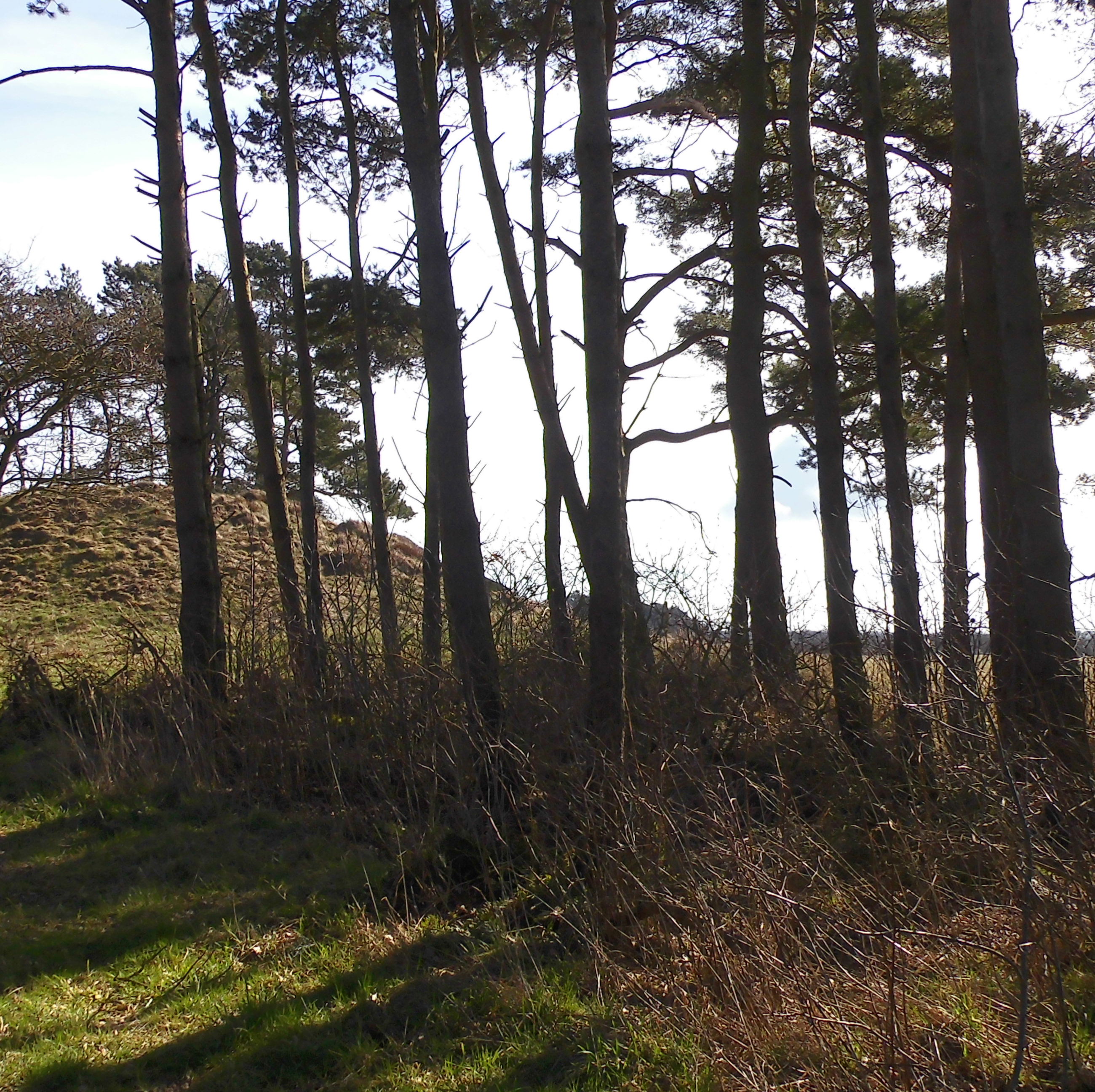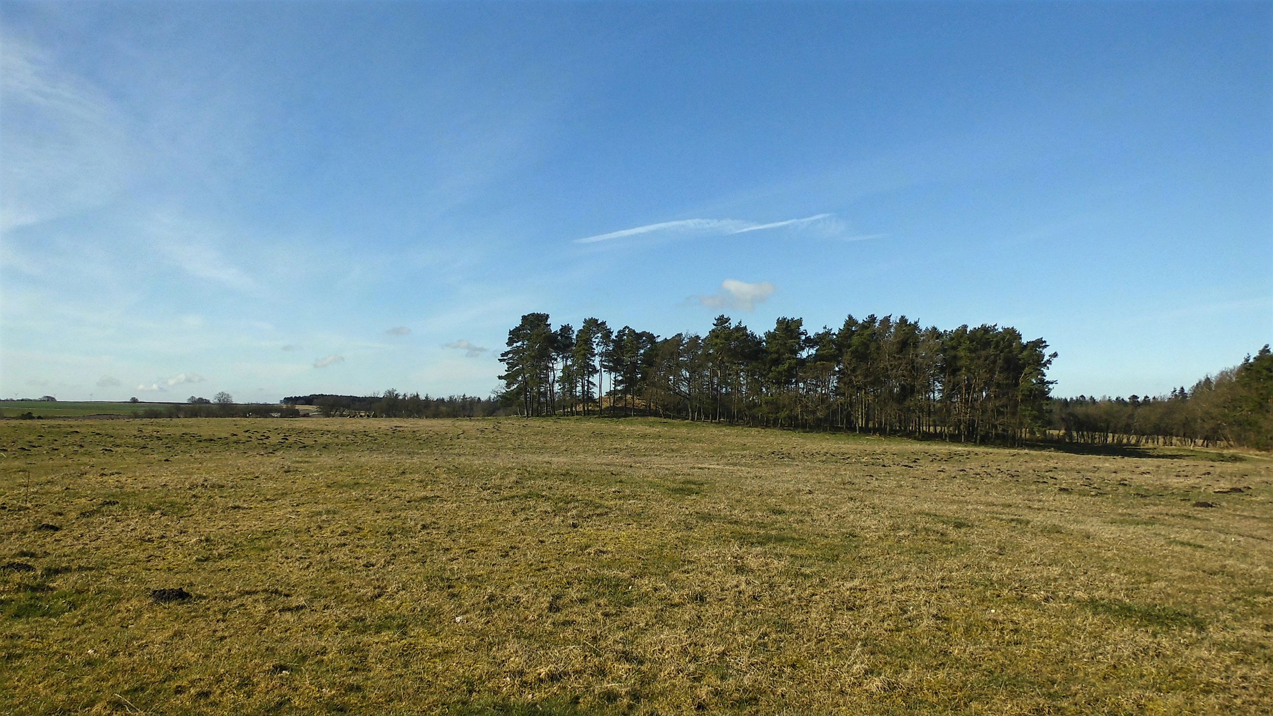 I sydsiden af en lille fyrrelund langs det vestlige markskel ligger først en stor gravhøj, som formodes at være opført for 3-4.000 år siden i ældre bronzealder. Selvom gravhøjen stadig er ganske stor, har den oprindeligt været større. Højens top af afgravet og på siderne ses flere flade afgravninger og slid fra nyere tids agerbrug og afgræsning med kvæg. Trods beskadigelserne formodes højen stadig at rumme gravanlæg. Både de jordfæstegrave i udhulede egekister, som højen først rejstes over - og senere tilføjede sekundærgrave i form af stensatte brandgrave og gravurner.
