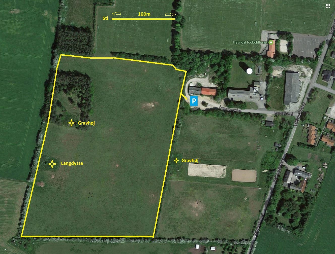 Lige syd for Havndal ligger tre fredede fortidsminder på den gamle Vester Hede. To gravhøje og tomten fra en langdysse viser sammen med mange nu sløjfede fortidsminder, at området har været tæt beboet i både sten- og bronzealderen. Fra parkeringspladsen for enden af Laursensvej leder en ca. 1 km lang sti langs markskellet rundt til fortidsminderne.