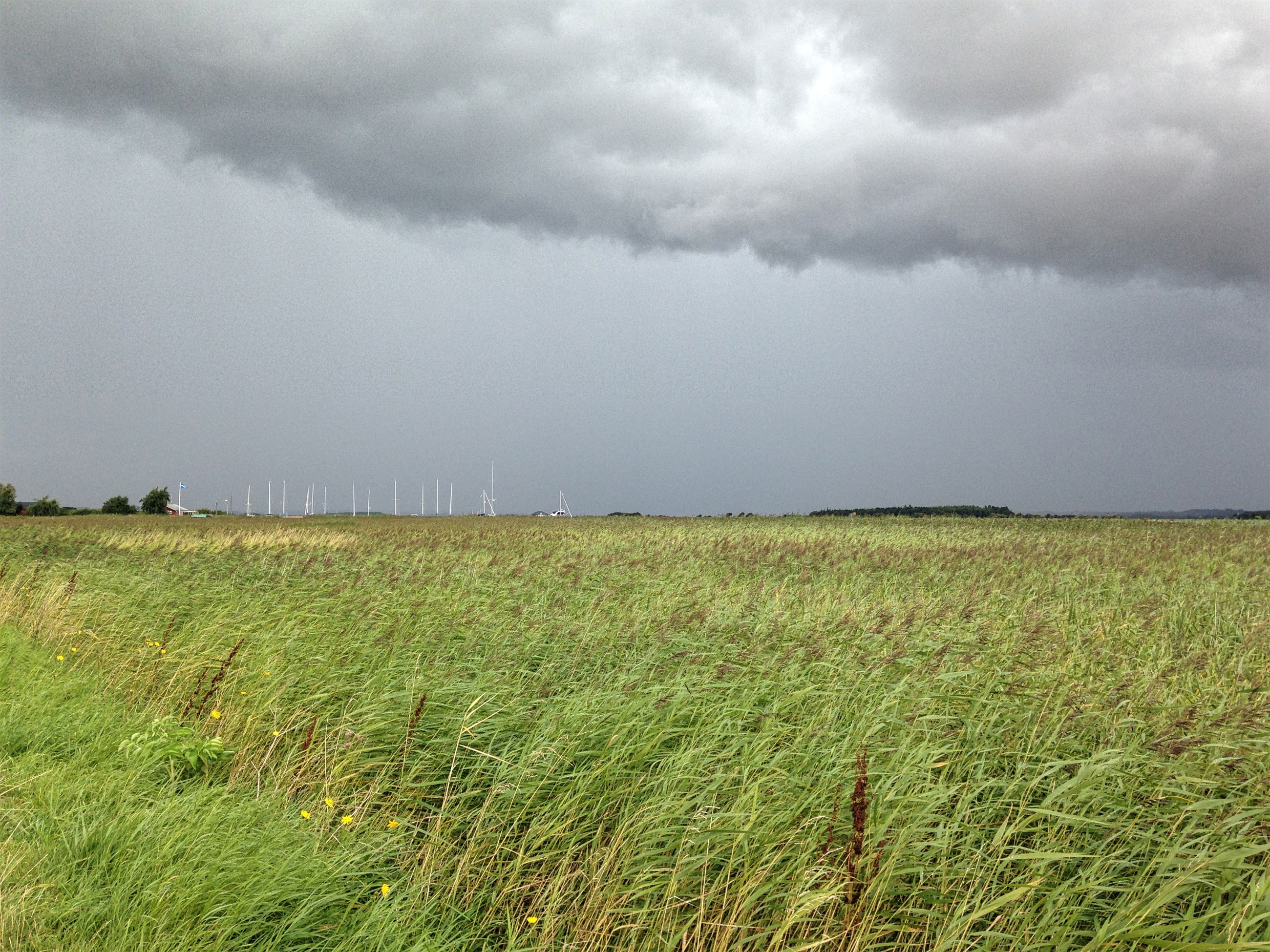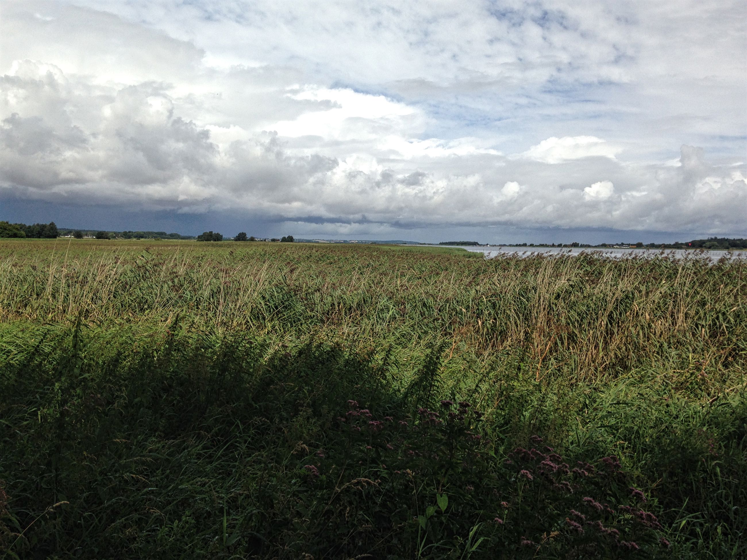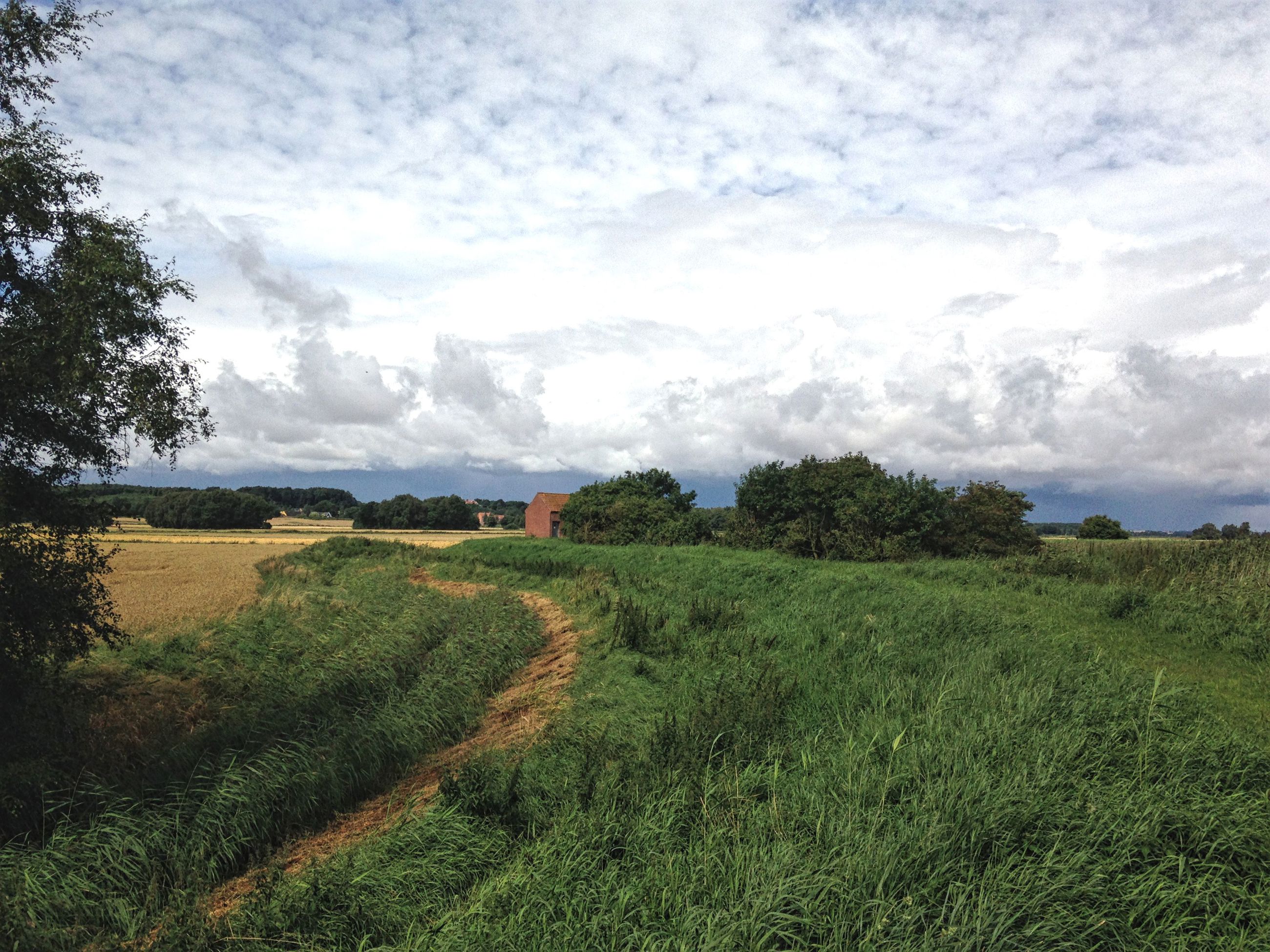 Gå op på diget bag færgehuset og følg diget ind ad langs fjorden. Hævet nogle få meter over havets overflade er der fri udsigt over Randers Fjord til venstre og de store, inddæmmede markarealer og skovene på de gamle fjordskrænter til højre.