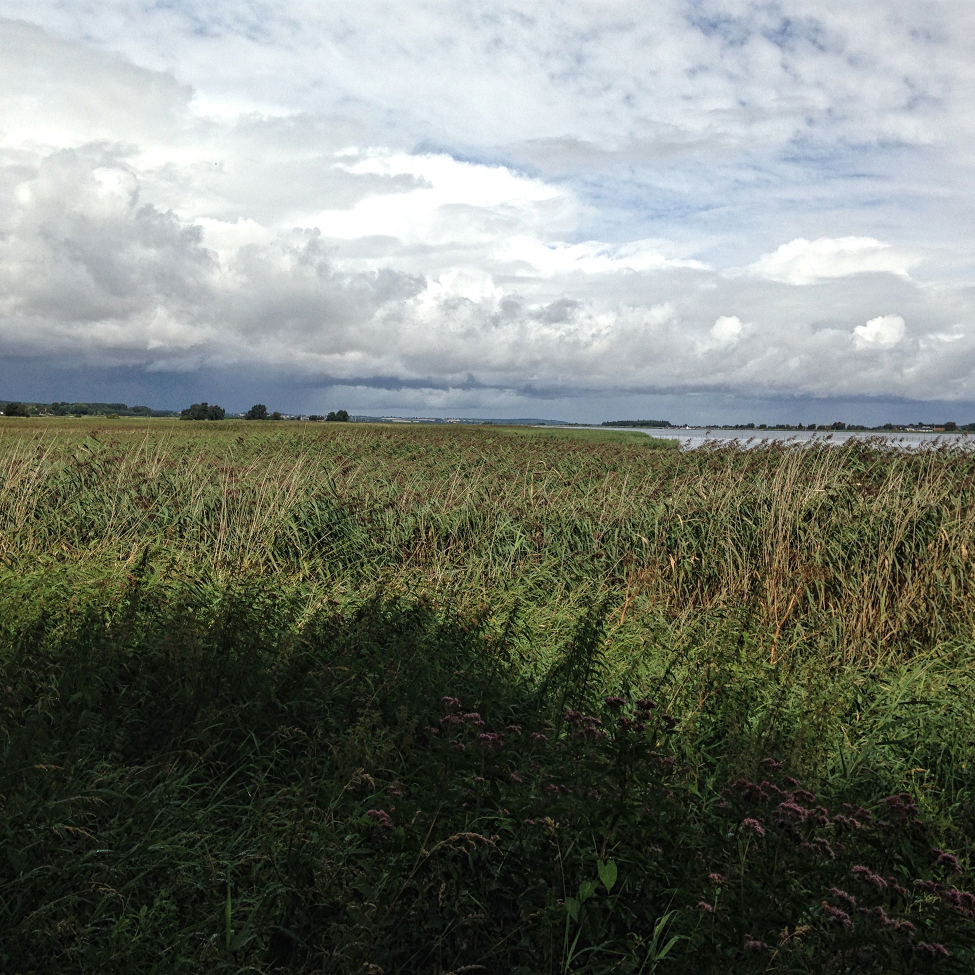 Gå op på diget bag færgehuset og følg diget ind ad langs fjorden. Hævet nogle få meter over havets overflade er der fri udsigt over Randers Fjord til venstre og de store, inddæmmede markarealer og skovene på de gamle fjordskrænter til højre.
