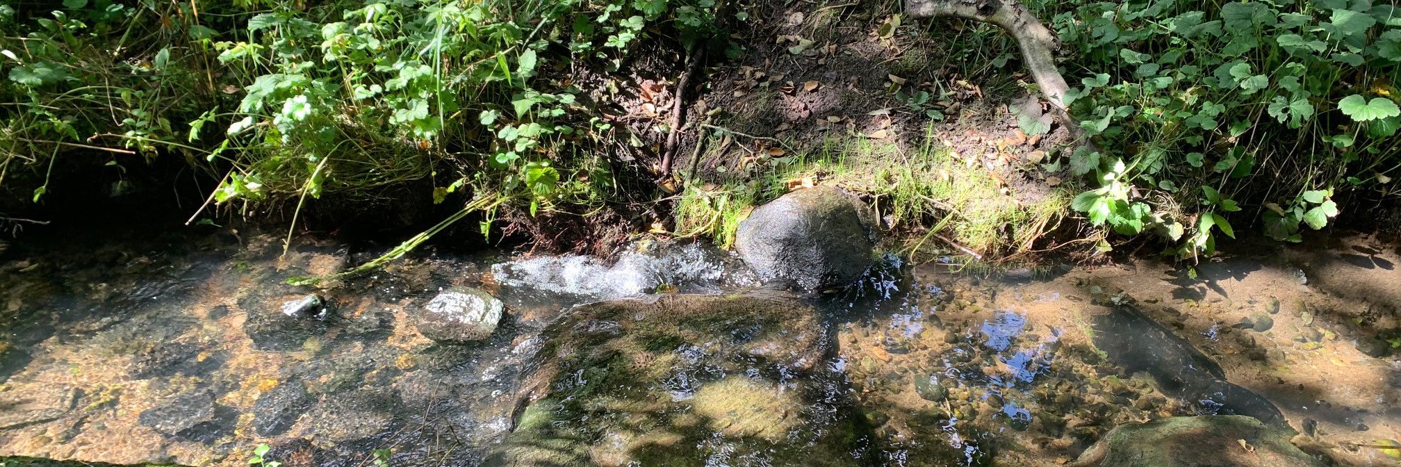 Hvor sporet starter, bliver møllebækken til et åbent vandløb lige syd for regnvandsbassinet. Her vokser der sommer og efterår en tæt bestand af foderkulsukker - en plante der i slutningen af 1800-tallet blev dyrket som foderafgrøde på grund af sin kraftige vækst.