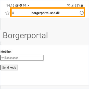 - Indtast dit mobilnummer og vælg ”Send kode”. Husk at indtaste +45 foran nummeret.