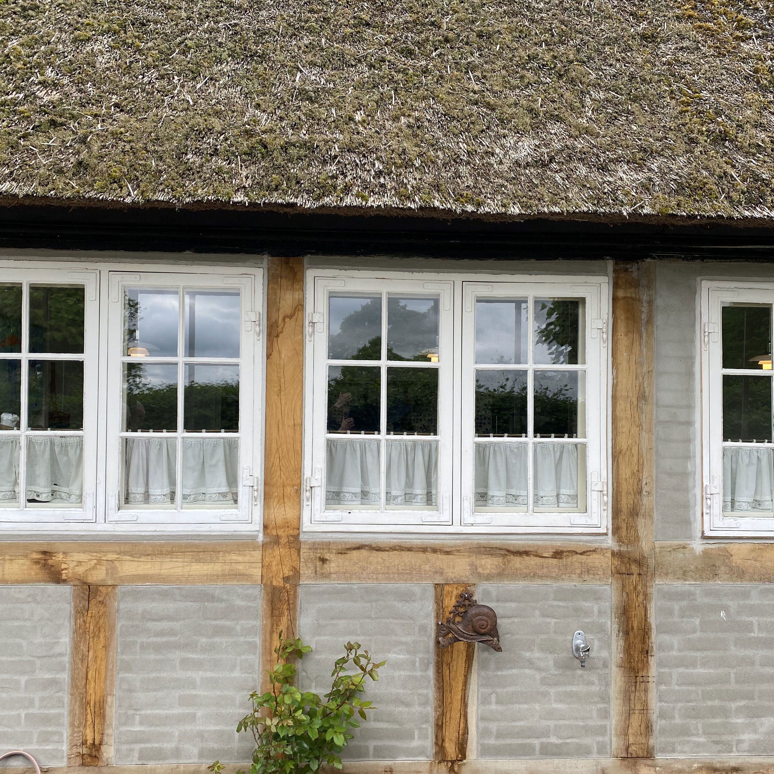 Ejer har udført arbejderne så det ligner det tidligere bindingsværk. Oprindelige vinduer er bevaret og genanvendt i facaden.