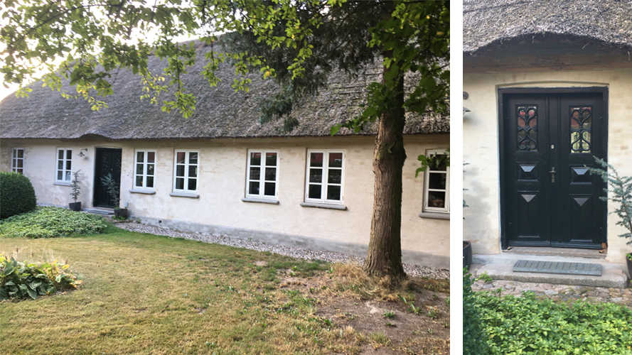 Den gule plastiske maling er erstattet af en diffusionsåben mørtel, så huset igen kan ånde. Fordør er nænsomt restaureret, så det kun er rådne dele der er udskiftet.