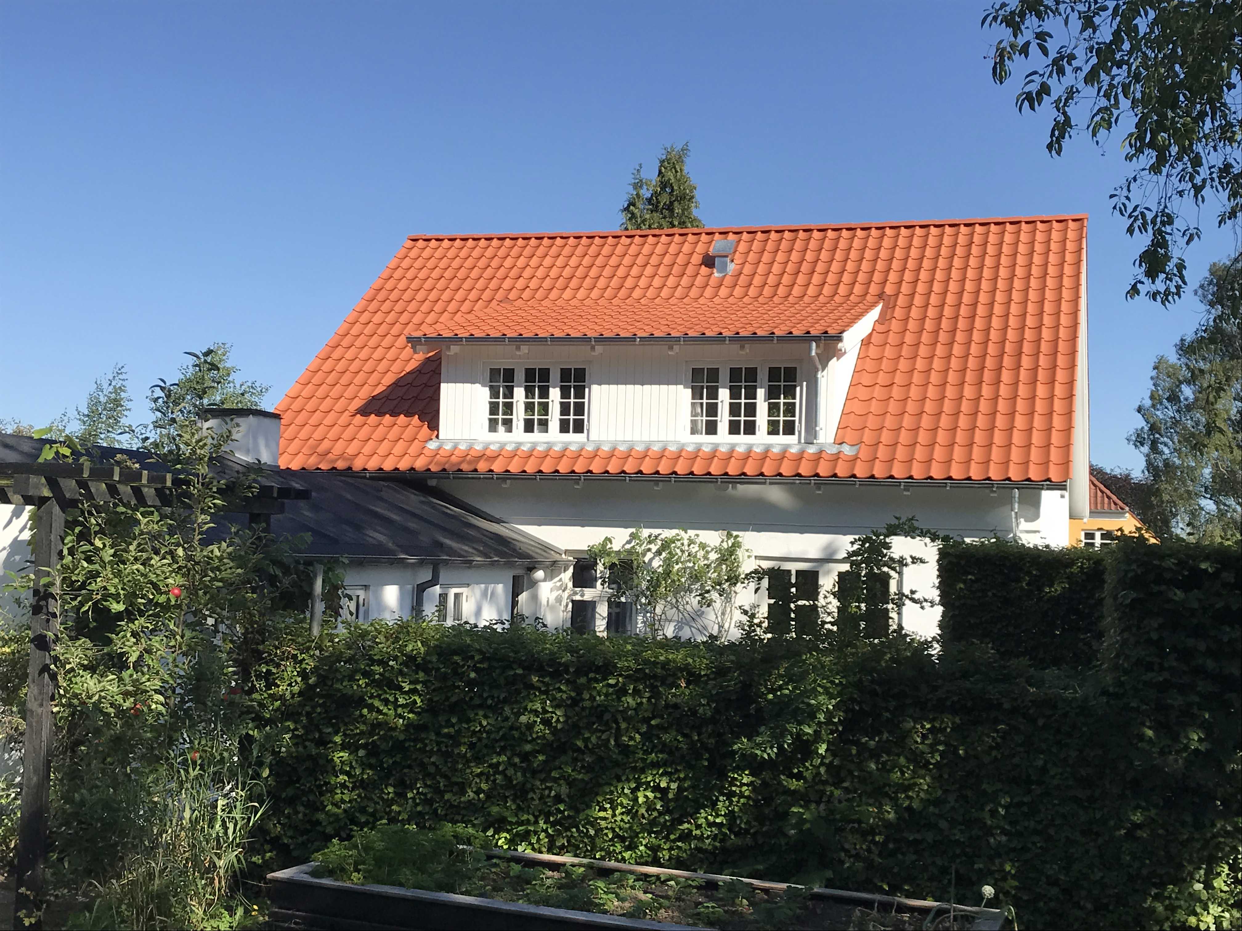 Der er opnået et flot resultat med udskiftningen, hvor der samtidig er tilføjet karakteristiske detaljer og tilpassede tagrender.