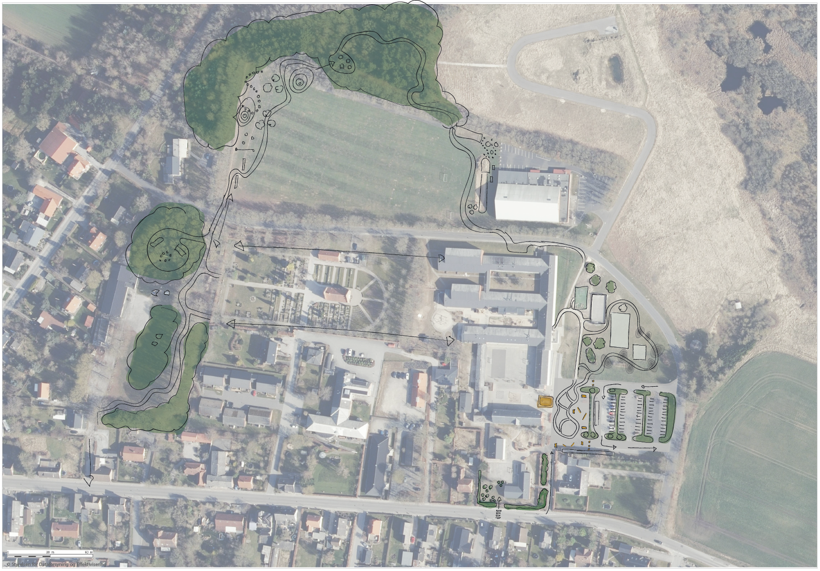 Bevægelse og leg skal understøttes, og skolens forbindelse til byen skal åbnes op. Der etableres derfor et legeområde på skolens forside, hvor der tages hensyn til områdets naturværdier. Der etableres desuden nye parkeringsforhold og en ny busholdeplads, så pladsen foran skolen fornys.