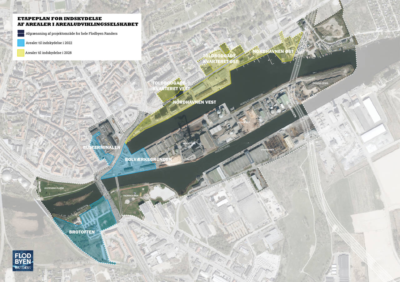 Randers Kommune har i 2021-22 gennemført et udbud for at finde en partner til et arealudviklingsselskab for de første etaper af Flodbyen. Konkret er der tale om følgende delområder: