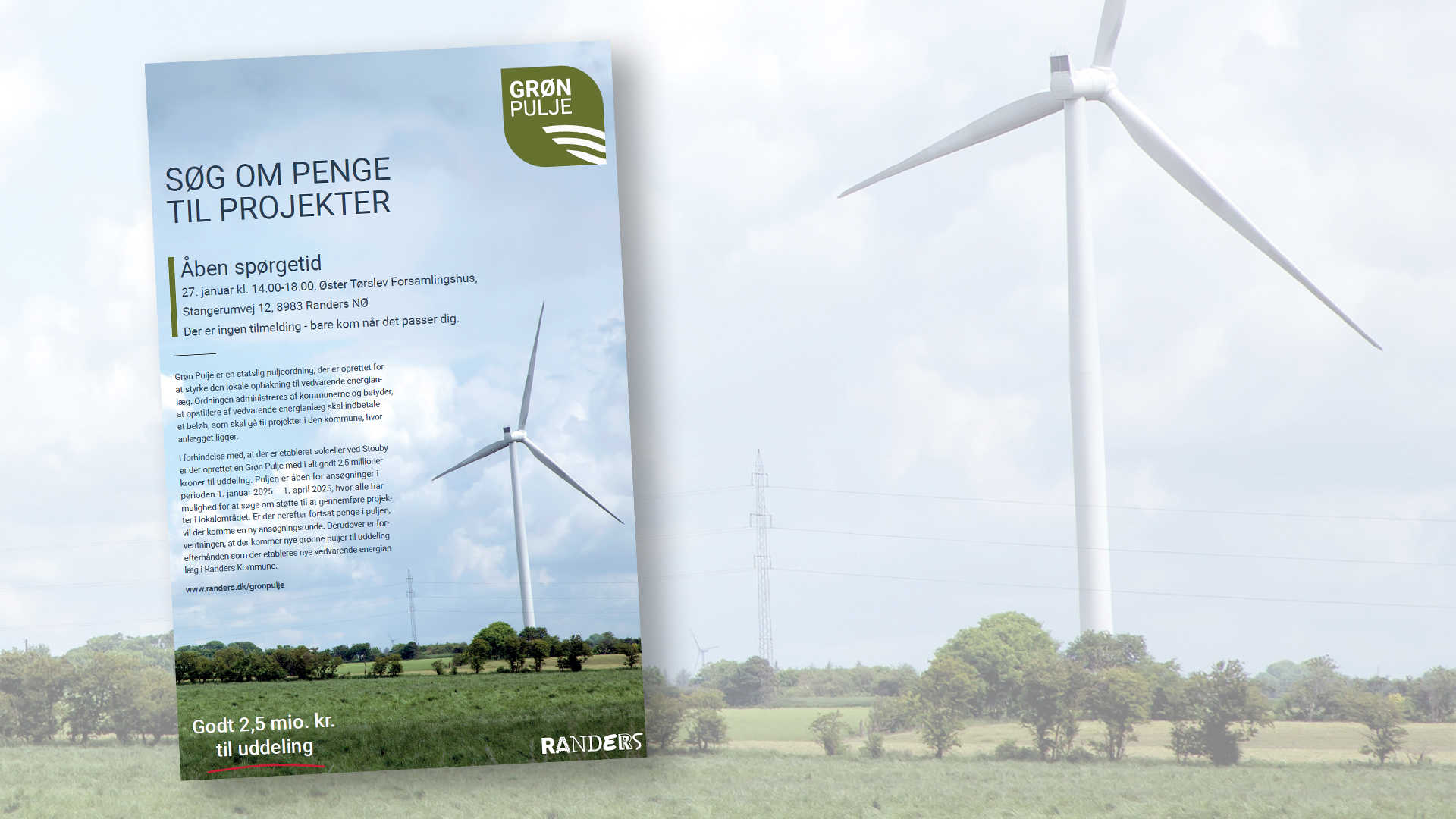 Grøn Pulje kan søges til grønne projekter i Randers Kommune. Puljen støtter særligt projekter, der ligger tæt på nye vedvarende energianlæg, f.eks. vindmøller og solceller.