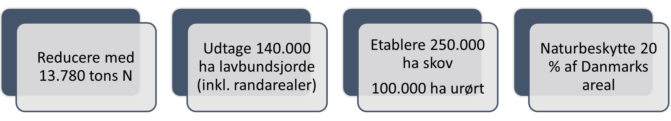 Aftalen betyder, at der skal laves planer for omlægning af landbrugsjord til lysåben natur og skov i hele Danmark. Aftalen indebærer, at der skal reduceres 13.800 tons kvælstof primært fra landbruget. Dette skal ske ved, at der udtages 140.000 ha lavbundsjorde, altså jorde der primært ligger i ådalene. Der skal etableres 250.000 ha skov, hvoraf 100.000 ha skal være urørt. 20 % af Danmarks areal skal ifølge aftalen være beskyttet natur.